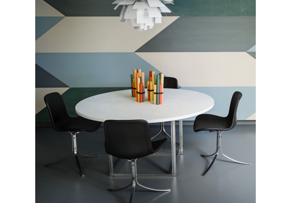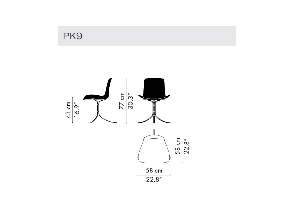 PK9 von Poul Kjærholm für Fritz Hansen entworfen, ist ein vollständig gepolsterter Stuhl aus Leder. Das dreibeinige Gestell ist aus gebürstetem, satiniertem Edelstahl.