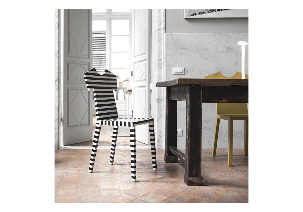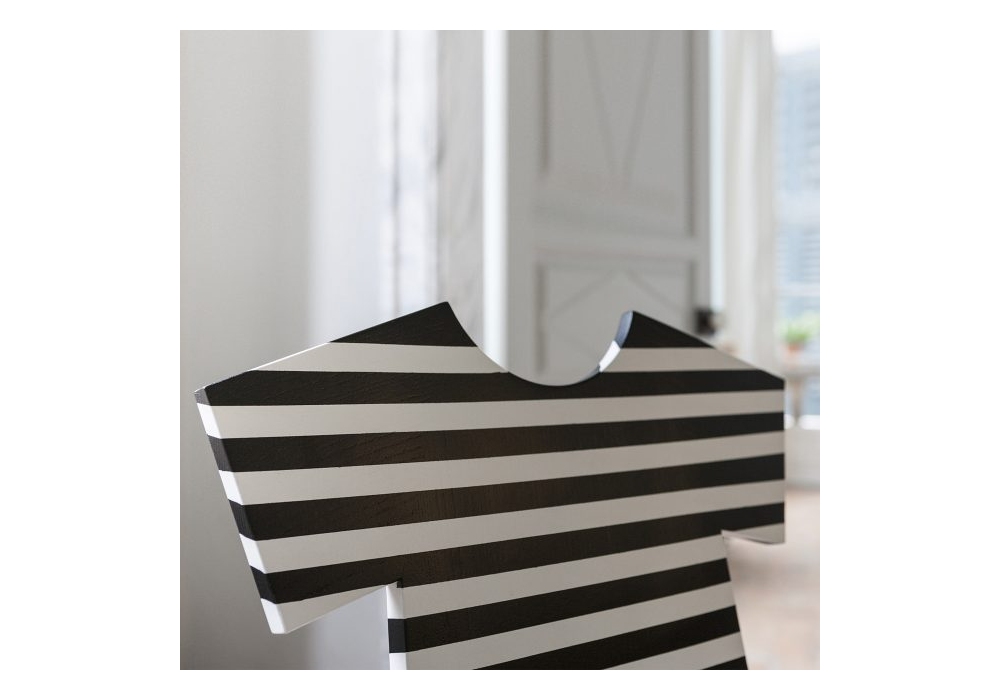 T-Chair von Annebeth Philips für Mogg entworfen, ist ein gestreifter Stuhl aus offenporiger matt lackierter massiver Esche nur in den Farben RAL 9016 Weiß und RAL 9017 Schwarz.