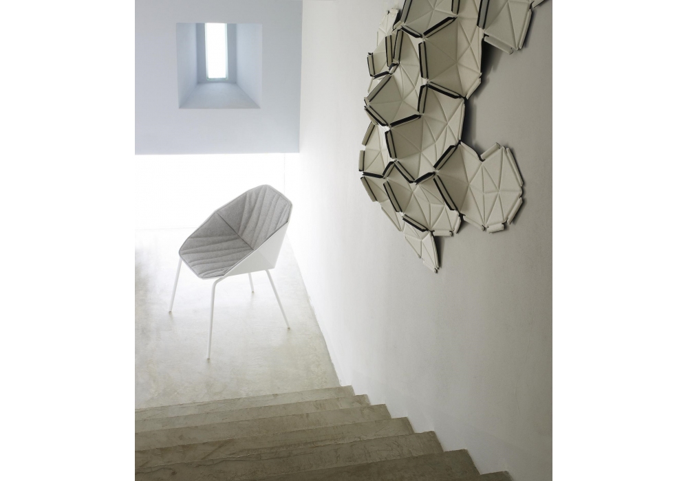 A resolutely urban graphic collection, easily accommodated and accessibly-priced. Designed by Hertel & Klarhoefer for Ligne Roset, The Rocher collection picks up on the trend for fractal design as characterised by its faceted construction. In actual fact the surface of the shell of the Rocher chair, an envelope which does duty as seat, back and arms, seems to have been cut like a diamond. It sits on four chromed steel feet, which could equally be finished in lacquer to match the shell.