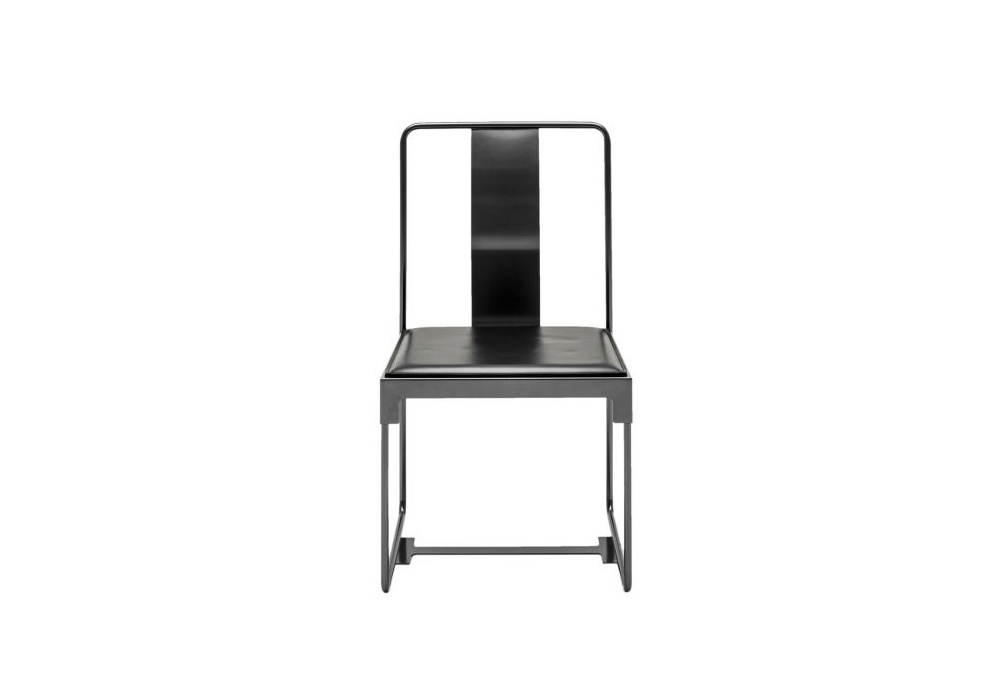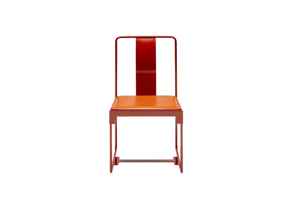 Mingx designed by Konstantin Grcic for Driade is a chair with structure in tubular and molded sheet steel coated with epoxy powder in orange, light gray, bronze and black. Abs feet. Sitting in leather. Indoor use only.