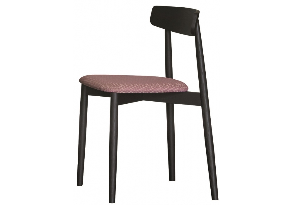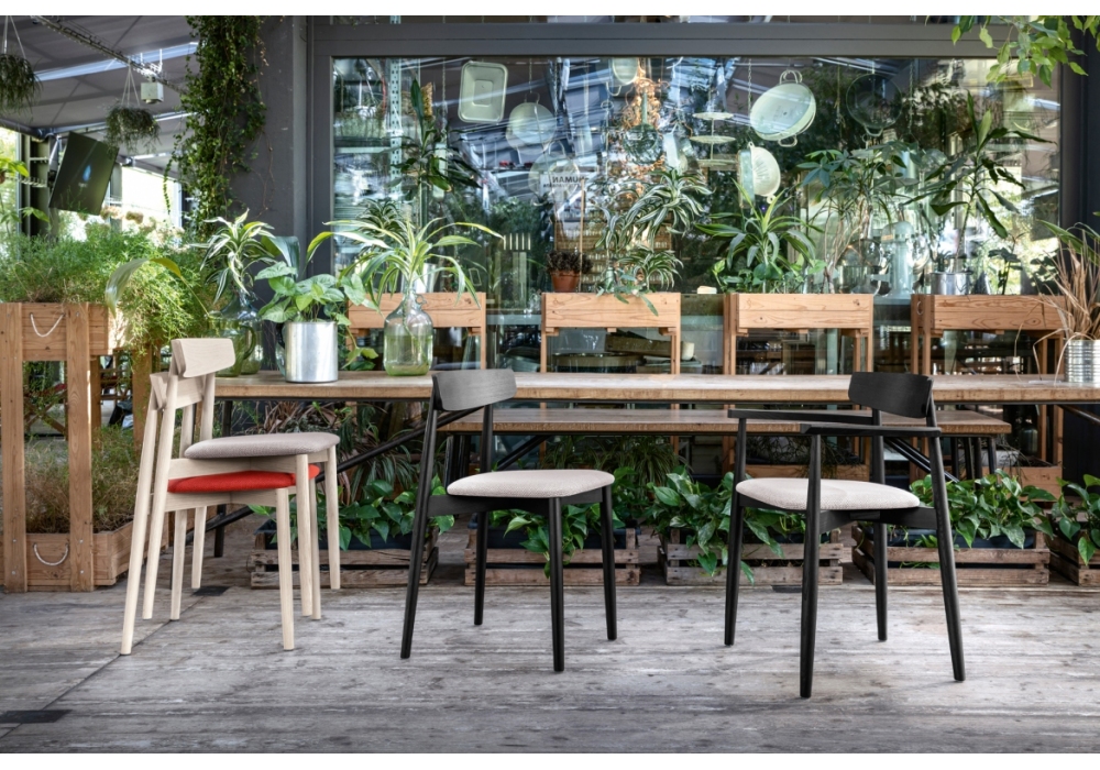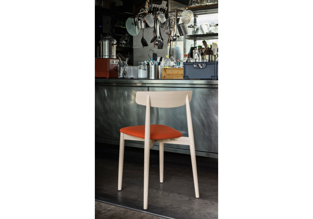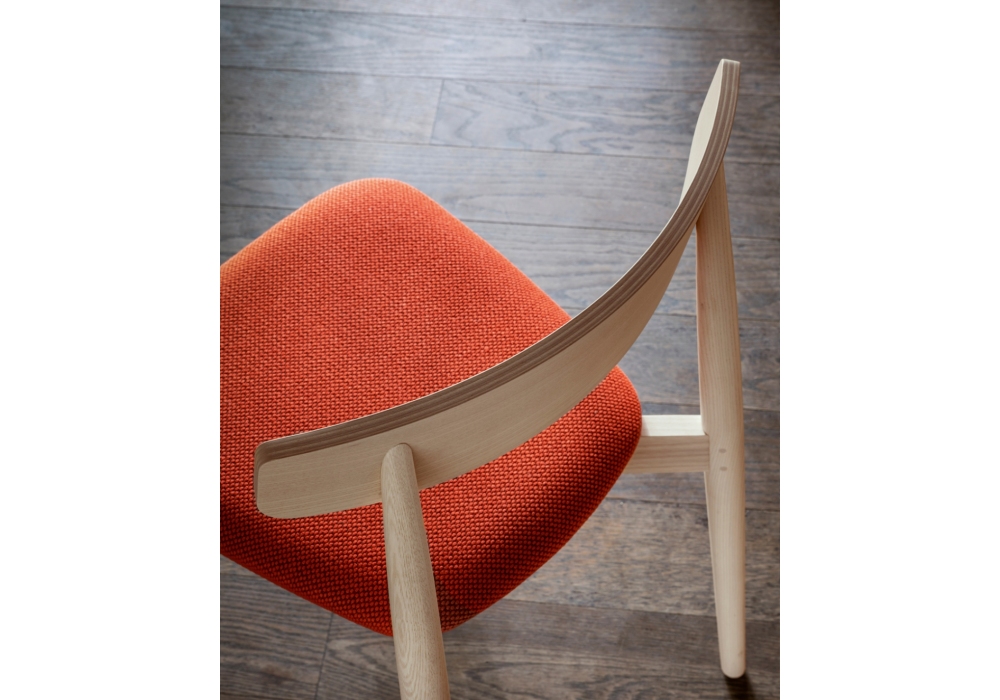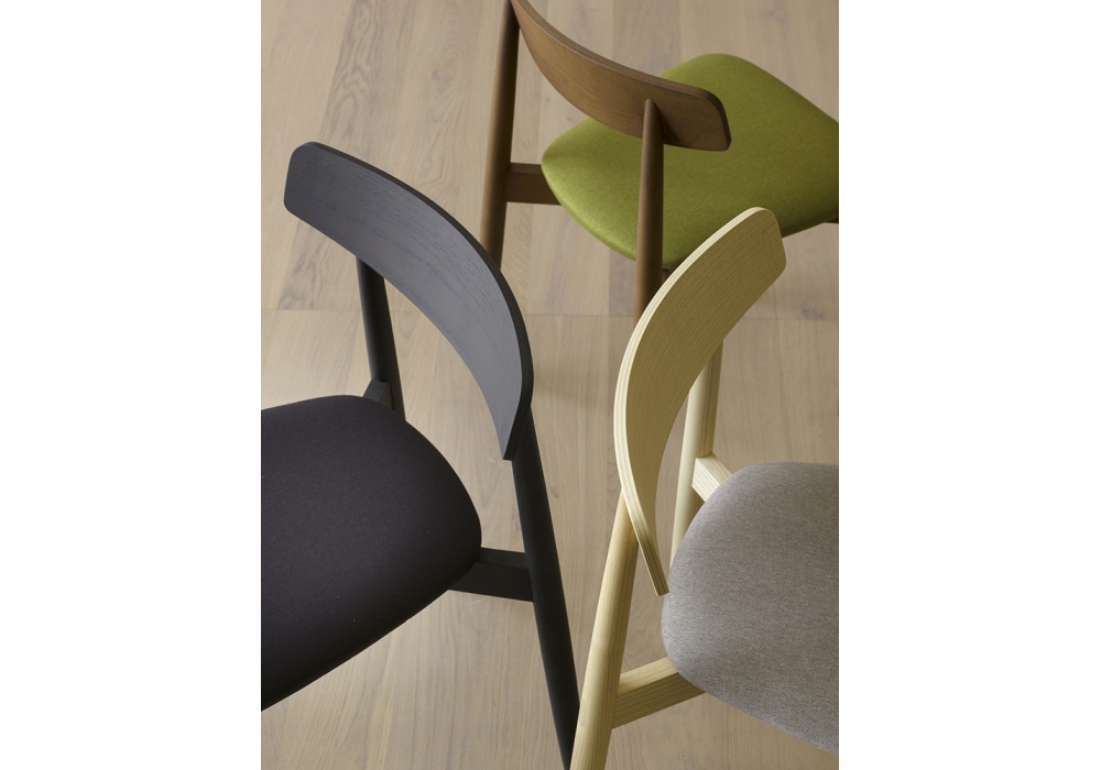 Claretta von Florian Schmid für Miniforms entworfen, ist ein stapelbarer Stuhl mit Gestell aus lackiertem Eschenholz oder Anilin, das in verschiedenen Farben erhältlich ist. Sitz aus Stoff.