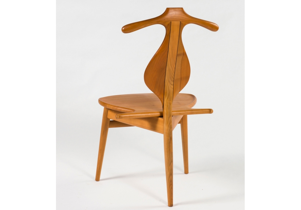 PP250 Valet Chair designed by Hans J. Wegner per PP Møbler is a wooden chair. The backrest works as a valet stand. The seat is hinged and can be placed in an upright position, underneath the seat a box is revealed for pocket emptier.