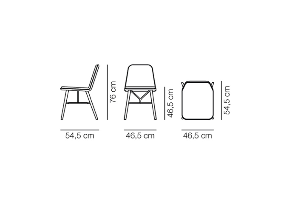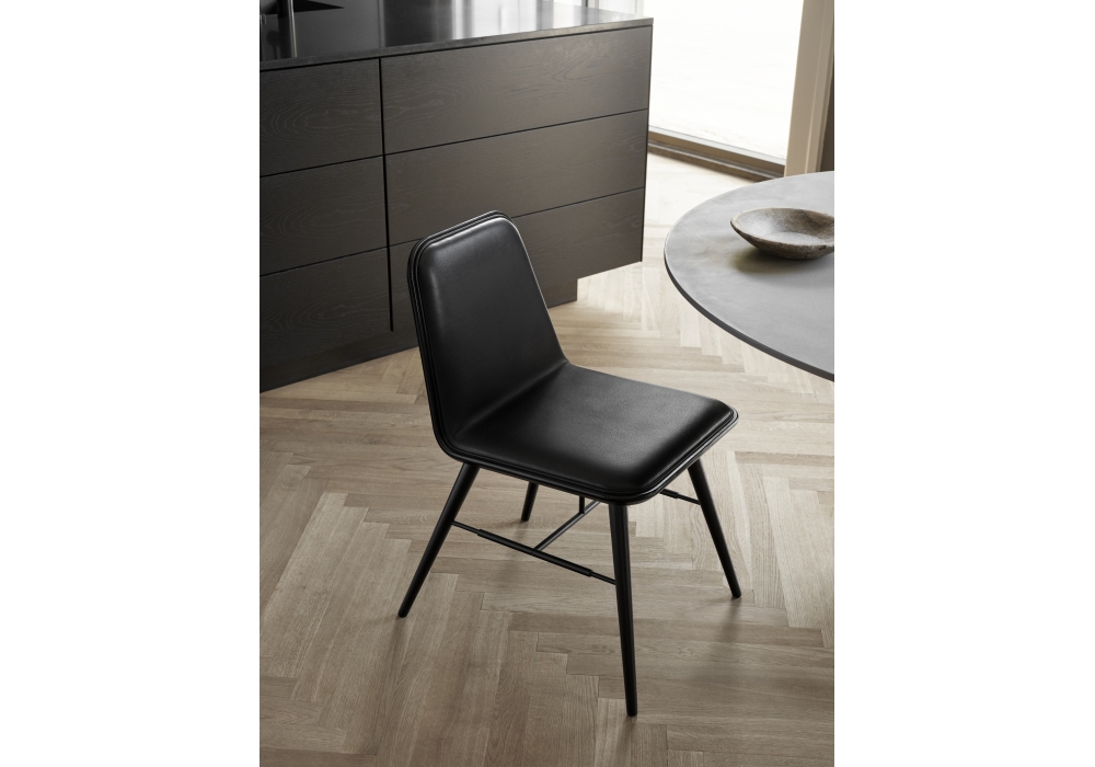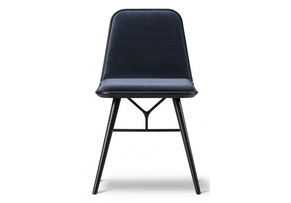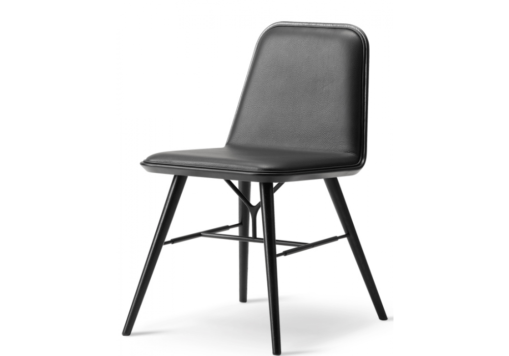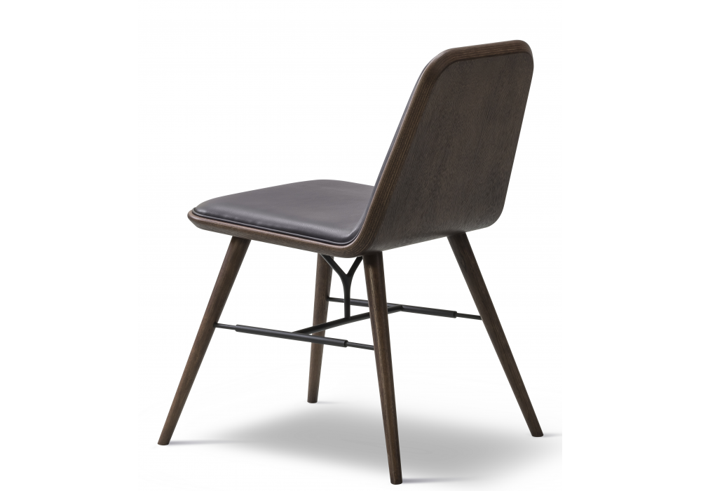 Spine von Space Copenhagen für Fredericia entworfen, ist ein Stuhl mit einer Struktur aus massivem Eichen- oder Eschenholz und einer pulverbeschichteten Metallstütze. Sitzschale aus Sperrholz mit Buchenkern. Vorderseite der Sitzschale mit Schaumstoff gepolstert und mit Stoff oder Leder bezogen, mit Keder versehen.
