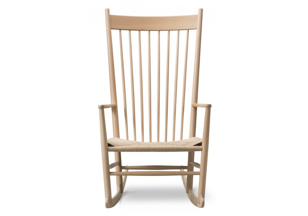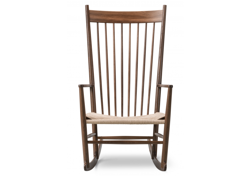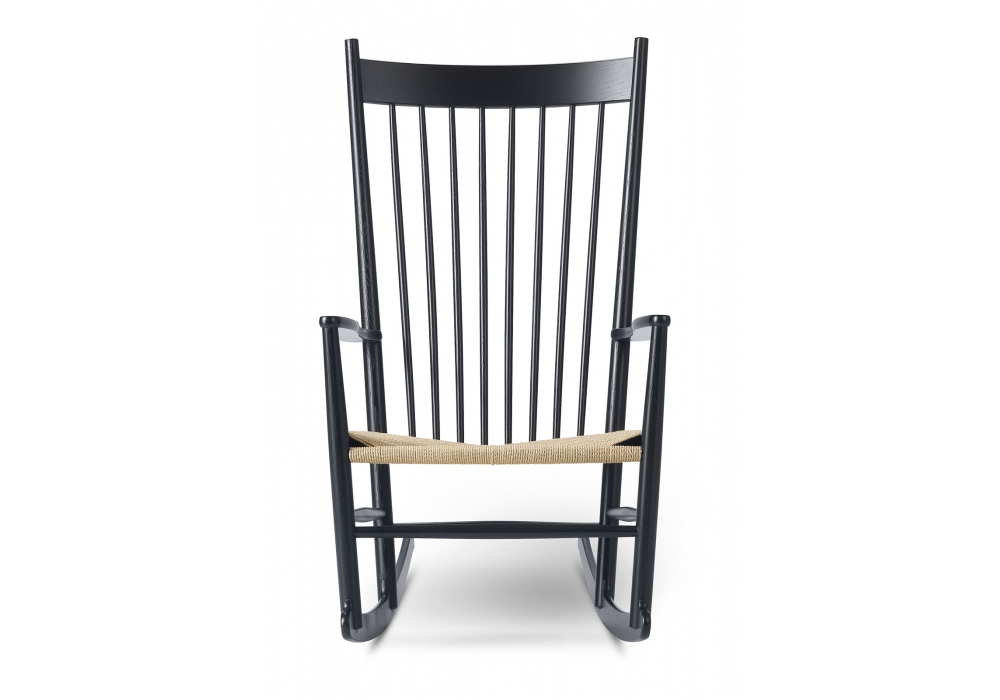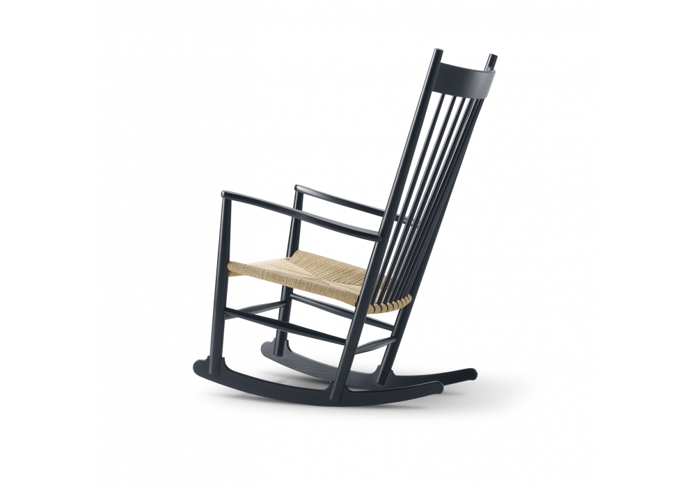 Wegner J16, entworfen von Hans J. Wegner für Fredericia, ist ein Schaukelstuhl aus massivem Eichen- oder Walnussholz. Sitz aus gewebtem Papierseil in natürlicher oder schwarzer Ausführung.
