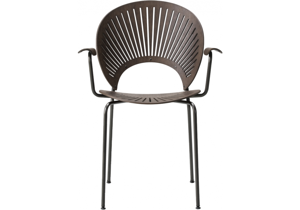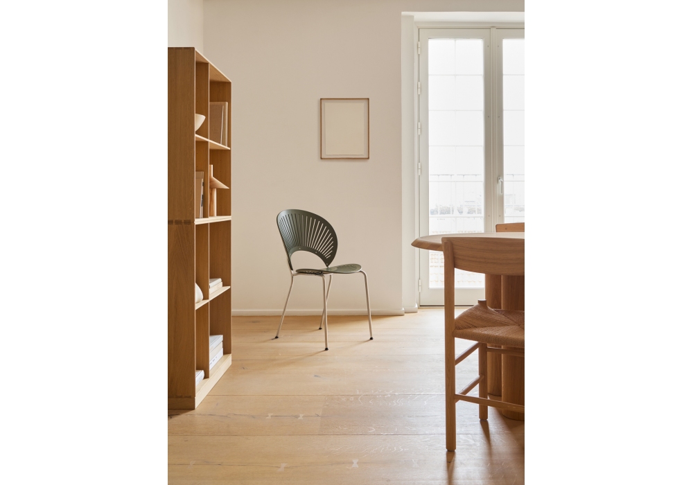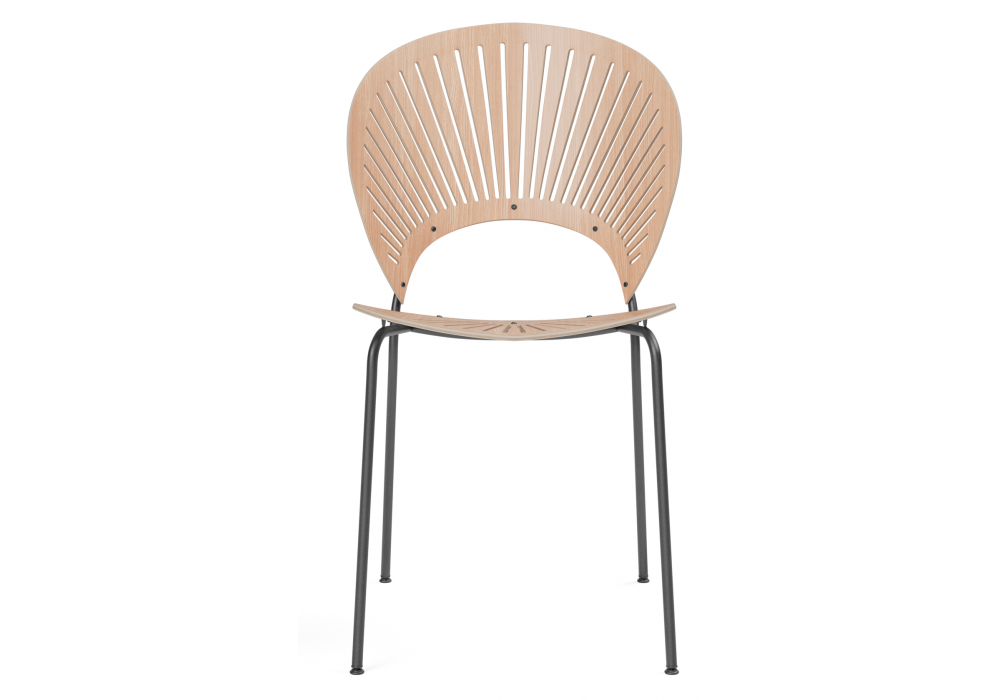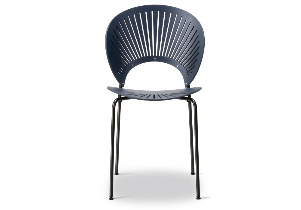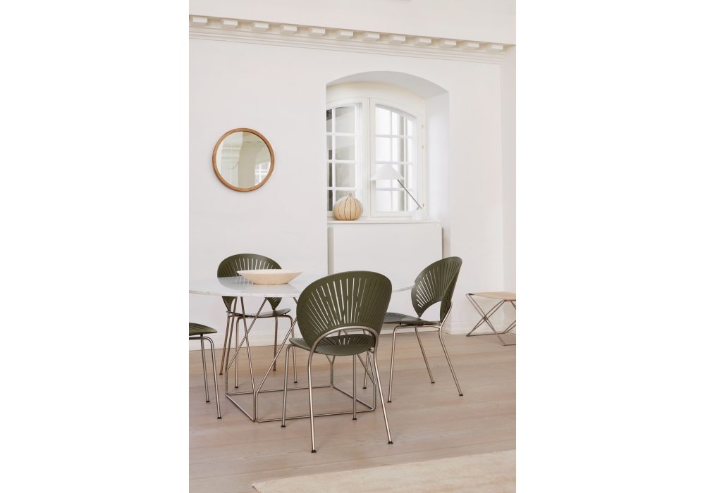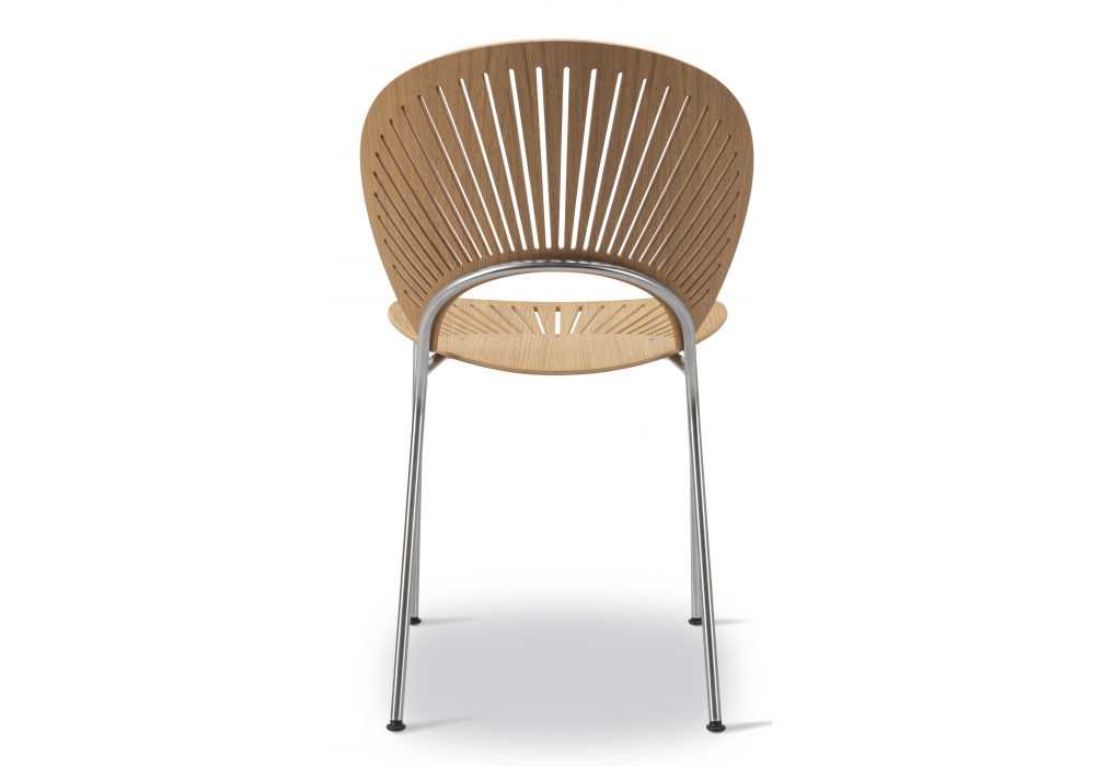 Trinidad von Nanna Ditzel für Fredericia entworfen, ist ein Stuhl mit Stahlrohrstruktur und Rückenlehne aus Sperrholz, modelliert mit CNC-gefrästen Ausschnitten. Sitz und Rückenlehne mit Nieten befestigt. Erhältlich mit oder ohne Armlehnen.