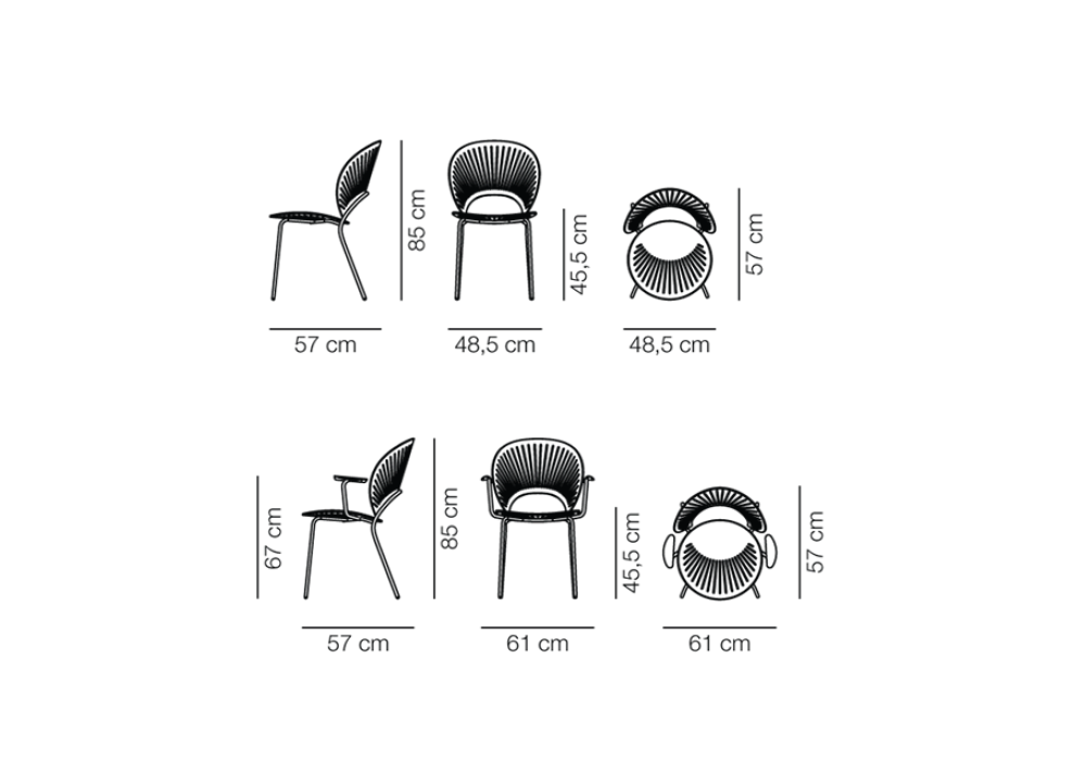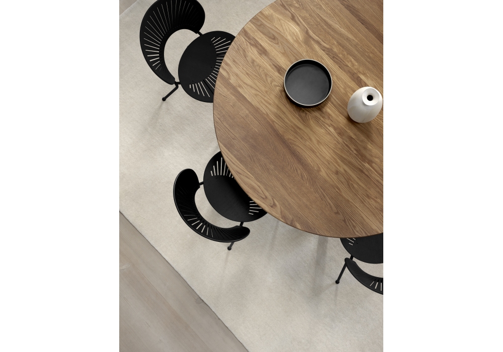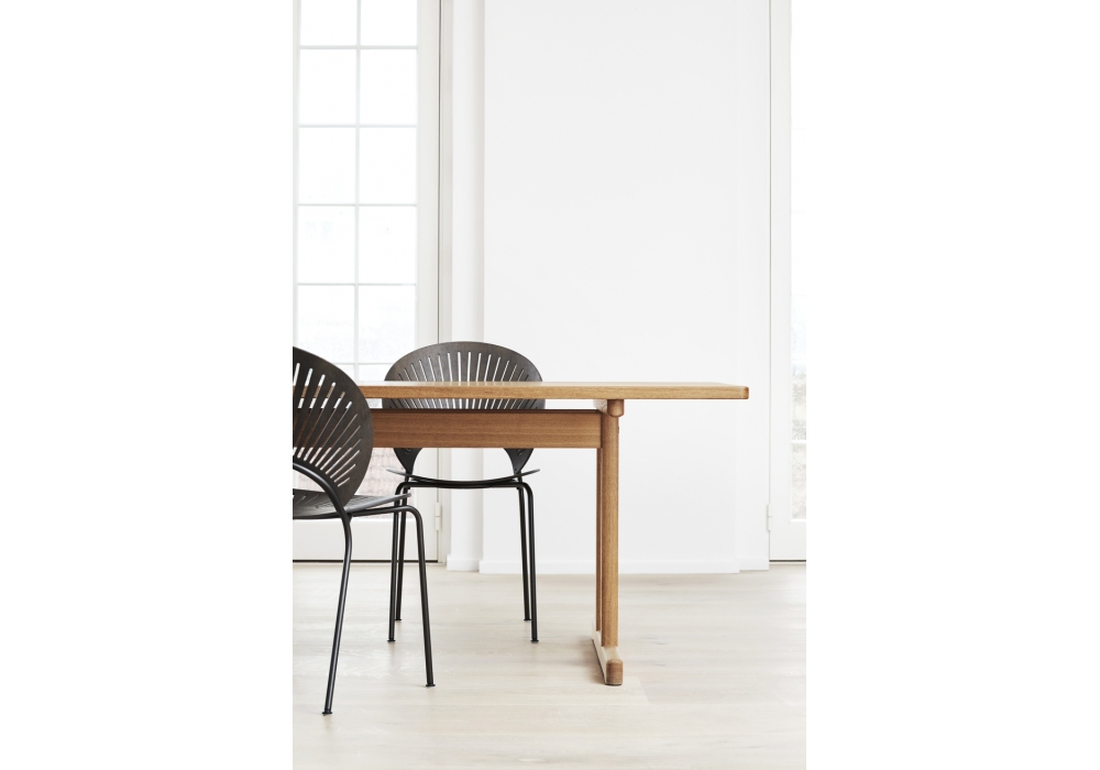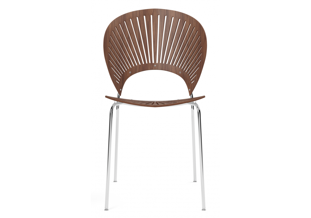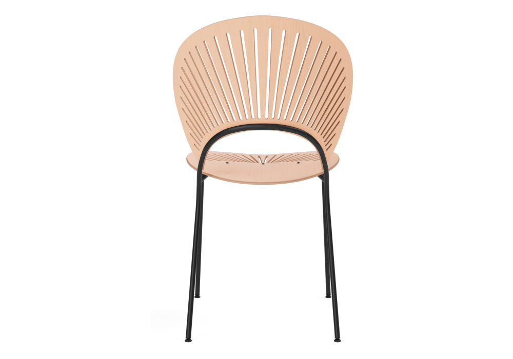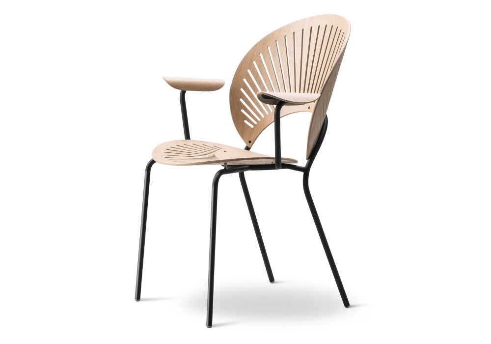 Trinidad von Nanna Ditzel für Fredericia entworfen, ist ein Stuhl mit Stahlrohrstruktur und Rückenlehne aus Sperrholz, modelliert mit CNC-gefrästen Ausschnitten. Sitz und Rückenlehne mit Nieten befestigt. Erhältlich mit oder ohne Armlehnen.