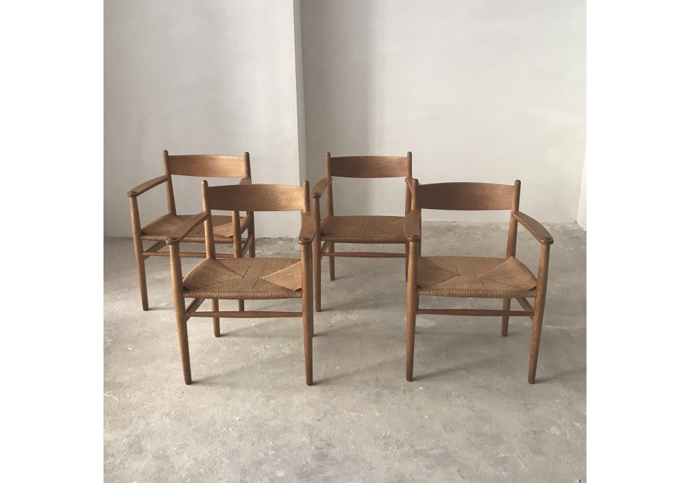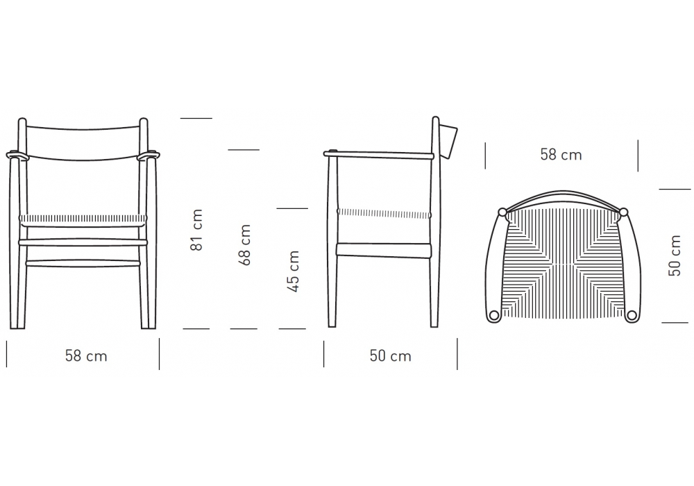 CH37 von Hans J. Wegner für Carl Hansen & Søn entworfen, ist ein Stuhl mit Armlehnen mit Struktur aus massiver Buche oder Eiche in verschiedenen Ausführungen. Sitz aus natürlichem oder schwarzem Stroh.
