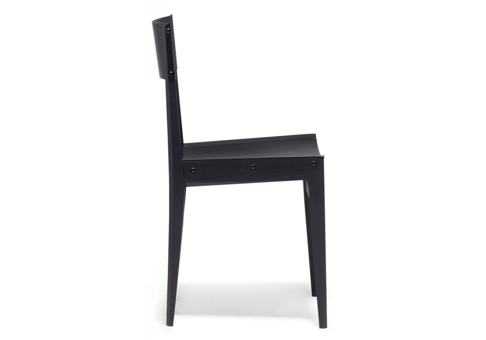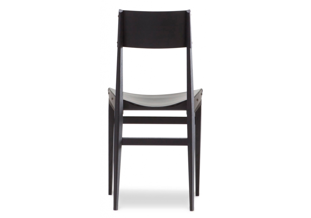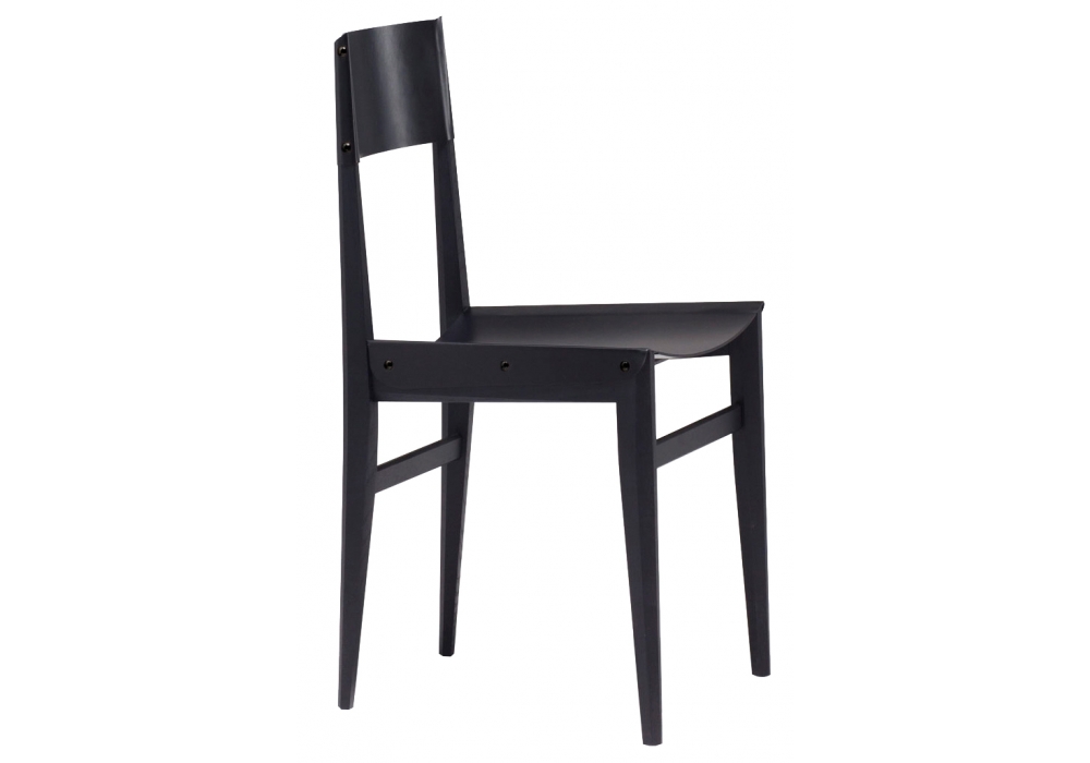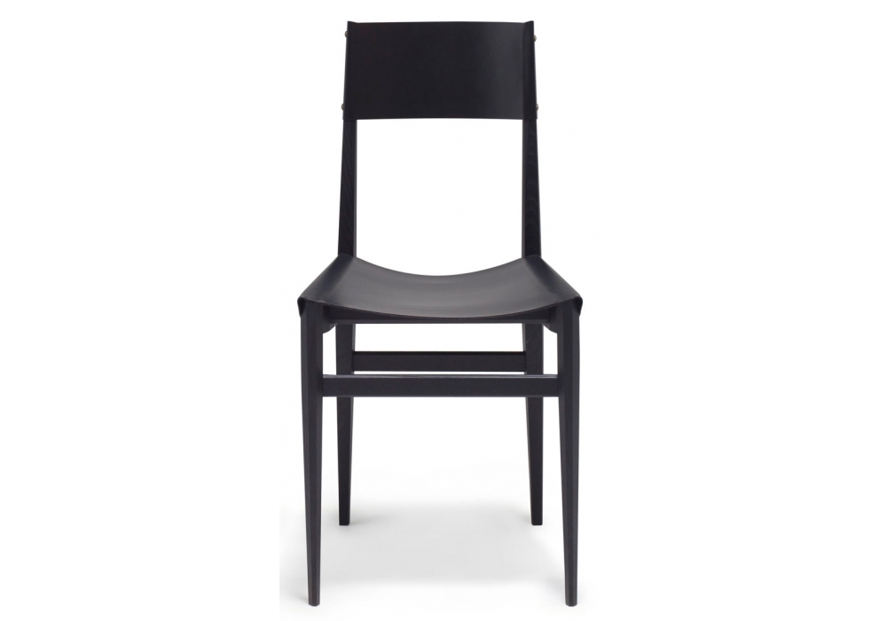 Milvia von Studiopepe für Ivano Redaelli entworfen, ist ein Stuhl mit Gestell aus schwarzer Esche oder Eiche. Der Sitz und die Rückenlehne sind mit Vollnarbenleder bezogen, das mit Metallnieten in Messingoptik befestigt ist. Milvia ist in verschiedenen Struktur- und Bezugsausführungen erhältlich.