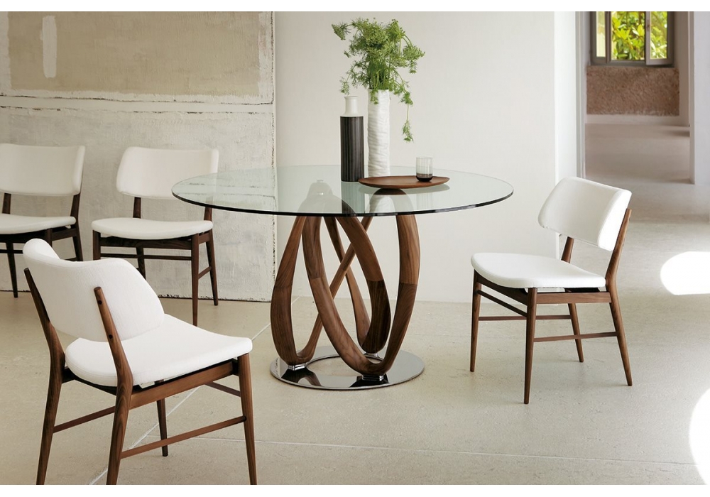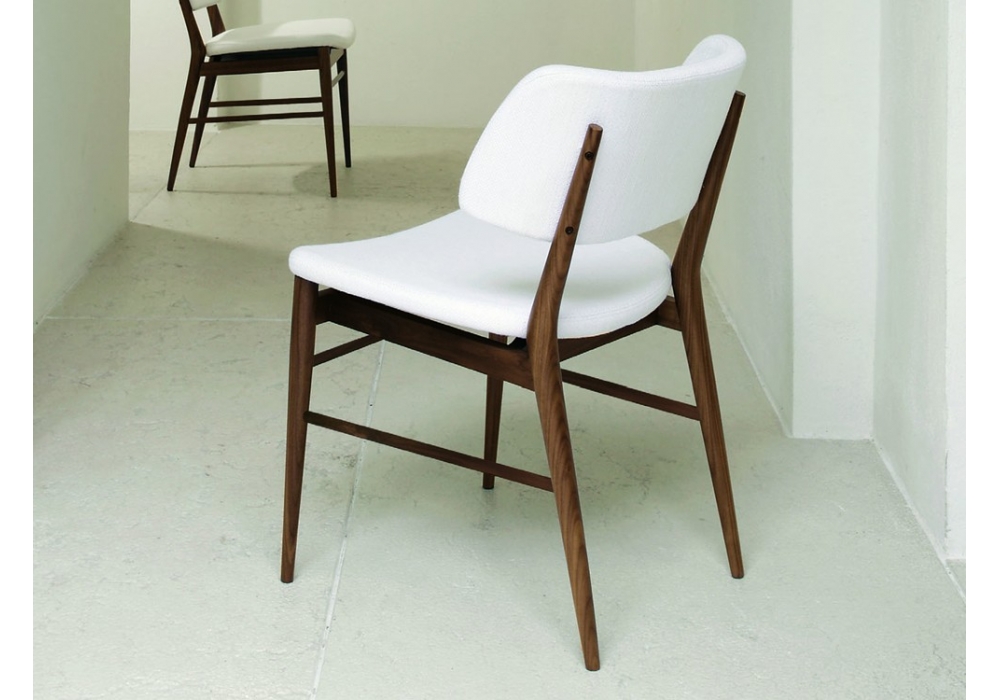 Nissa, von T. Zappa für Porada entworfen, ist einer Stuhl mit Struktur aus massivem Canaletta Nussbaum oder matt lackierten geschlossenen Poren und Polsterung in Leder oder Stoff. Verfügbar mit oder ohne Armlehnen.