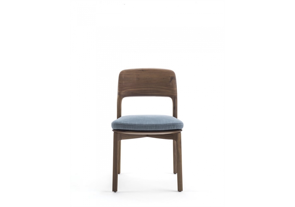 Emma, von Patrick Jouin für Porada entworfen, ist einer Stuhl in Canaletto Nuss mit gepolstertem Sitz in Stoff oder Leder.