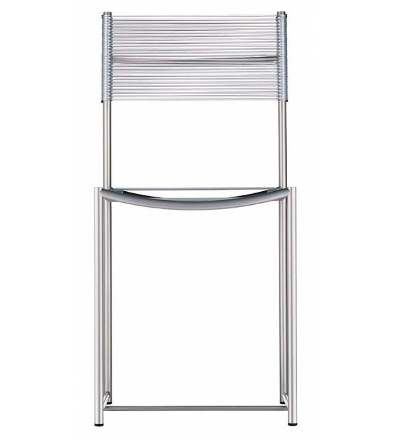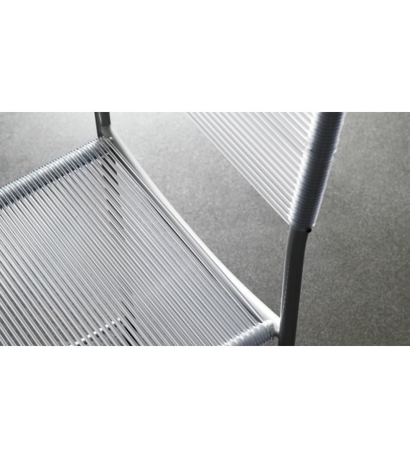 Spaghetti 101, entworfen von Giandomenico Belotti für Alias, ist ein Stuhl aus gebürstetem Edelstahl oder verchromter Struktur, Sitz und Rückenlehne aus PVC. Erhältlich in verschiedenen Ausführungen.