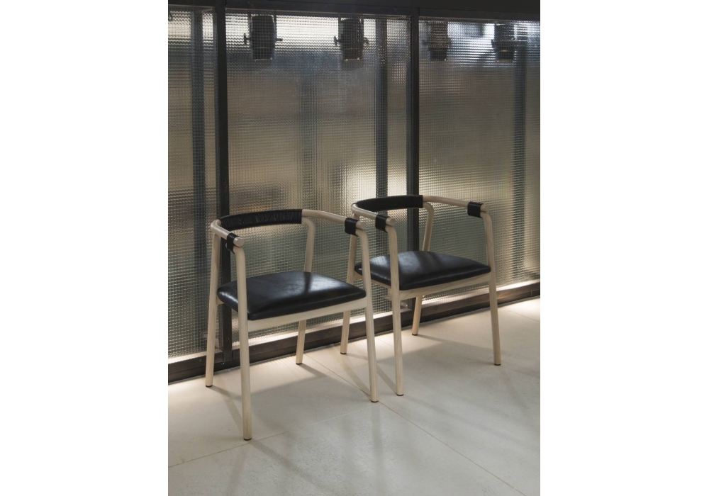 Rivulet von Junpei & Iori Tamaki für Living Divani entworfen, ist ein Stuhl mit röhrenförmiger Struktur, verfügbar aus Edelstahl oder Eschenholz, Sitz mit Stoff oder Leder gepolstert und Weben aus Sattelleder.