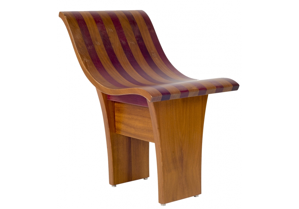 Karékla von Salvatore Longo für Ornythos entworfen, ist ein Holzstuhl. Die Sitzfläche besteht aus abwechselnd zwei Holzarten aus Iroko und Purpur.