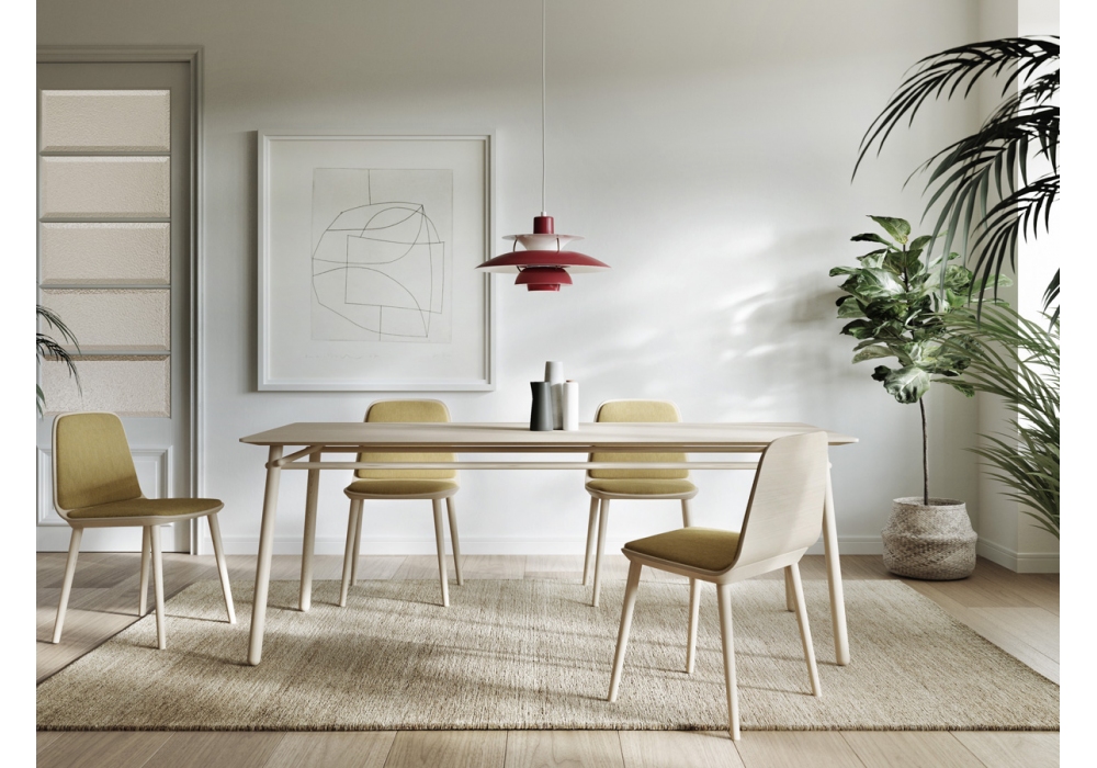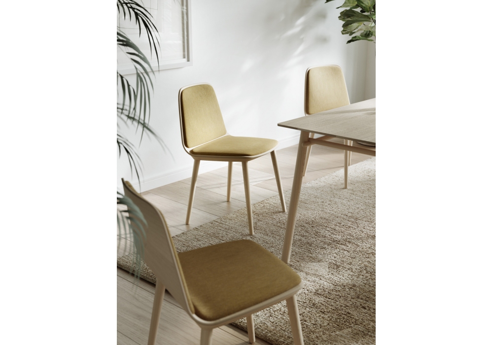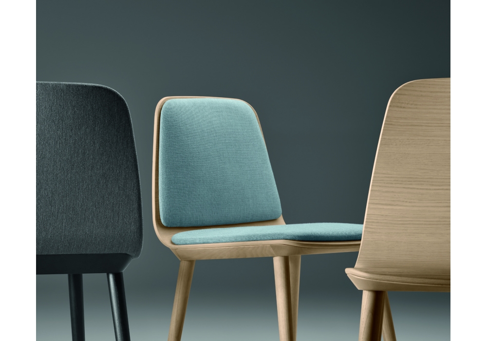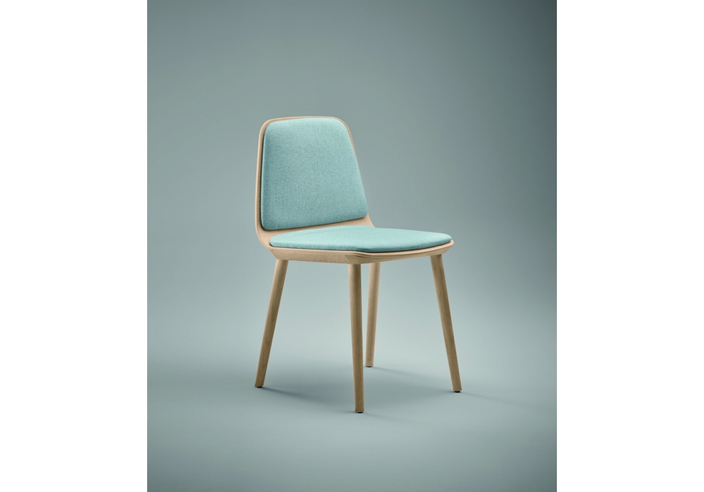 Bisell, entworfen von Estudi Manel Molina für Treku, ist ein Stuhl, der frontal mit einem Fuß aus Holzbeinen in verschiedenen Ausführungen und einer Schale gepolstert ist, die mit Stoffbezügen in verschiedenen Farbtönen erhältlich ist.