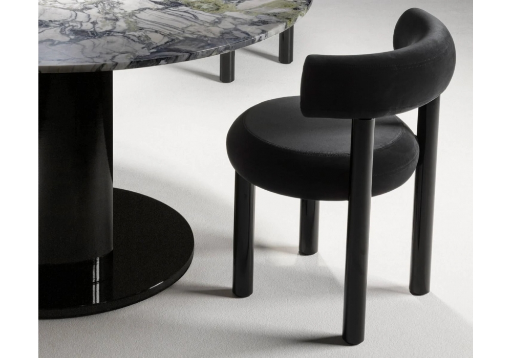 Fat Dining Chair von Tom Dixon entworfen, ist ein Esszimmerstuhl mit Sitz und Rückenlehne, die mit Formschaumstoff und Stoff bezogen sind. Struktur aus glänzend schwarz pulverbeschichtetem Stahl.