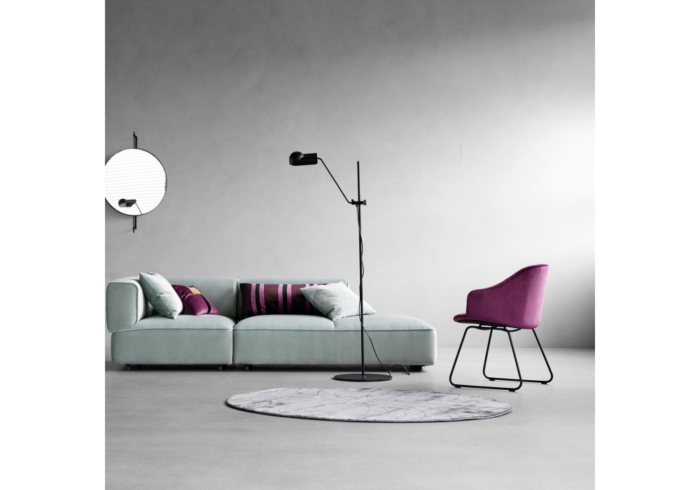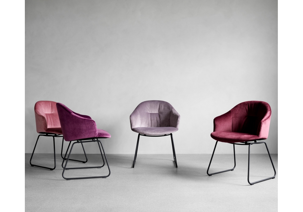 Versu, von 365 North für Wendelbo entworfene, ist ein Stuhl mit Beinen aus schwarz oder weiß pulverbeschichtetem Stahl, Polsterung aus hochelastischem Schaumstoff und Überzug verfügbar aus Leder oder Stoff.