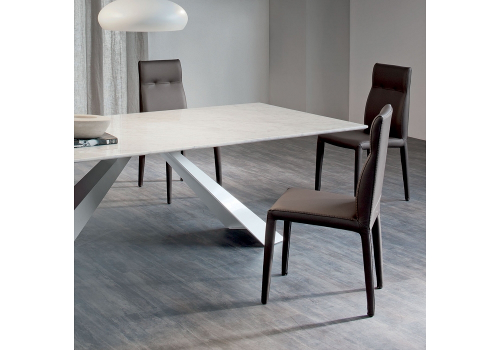 Agatha Flex, von Paolo Cattelan für Cattelan Italia entworfen, ist ein Stuhl mit Stahlkonstruktion, ist mit Leder, Öko-Leder oder Stoff bezogen. Verfügbar in zwei Größen.