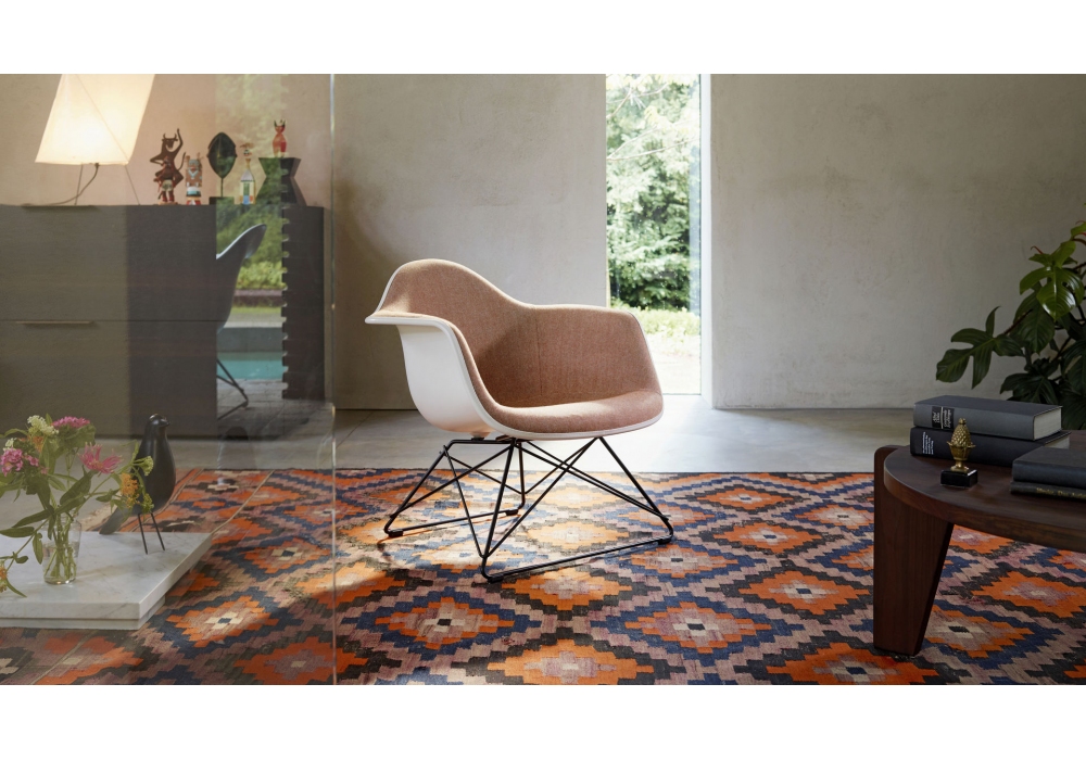 Eames Plastic Armchair LAR, entworfen von Charles und Ray Eames für Vitra, ist ein gepolsterter Sessel aus der LAR-Kollektion mit einer Schale aus Polypropylen, die in verschiedenen Ausführungen und Stoffpolstern erhältlich ist. Basis mit Stahldrähten mit gekreuzten Pfosten in verschiedenen Ausführungen.