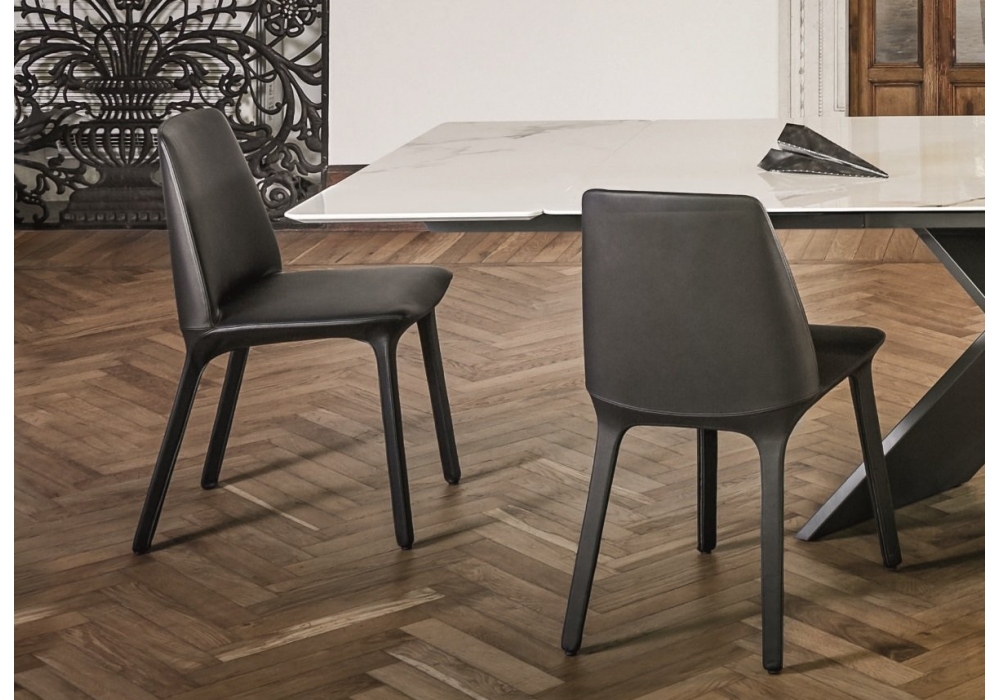 Flute, von Mauro Lipparini für Bonaldo entworfene, ist ein gepolsterter Stuhl mit Stahlkonstruktion, Polyurethanpolsterung und Polsterung aus Leder oder Öko-Leder.
