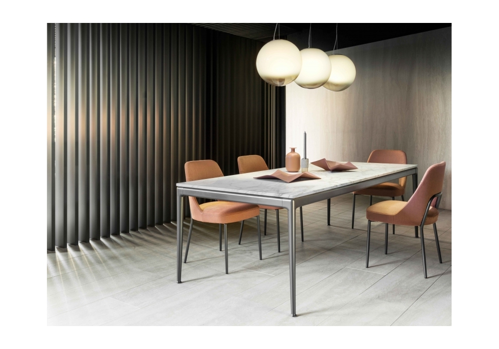 Joyce, von Design Center für Flexform entworfen, ist einer Stuhl mit Metallbeinen und Polsterung in verschiedenen Ausführungen aus Stoff und Leder.