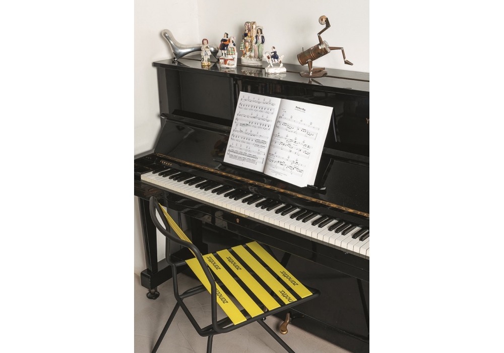 Dan von Patrick Norguet für Zanotta entworfen, ist ein Stuhl mit einer Struktur aus eisengrauem oder mattschwarz lackiertem Stahl. Sitz und Rückenlehne aus elastischen Bändern aus Polyestergarn in Gelb, Seil, Anthrazit und Blau. Das Zanotta-Logo ist auf dem ersten Gurt des Sitzes aufgedruckt und auf der rechten Seite platziert.