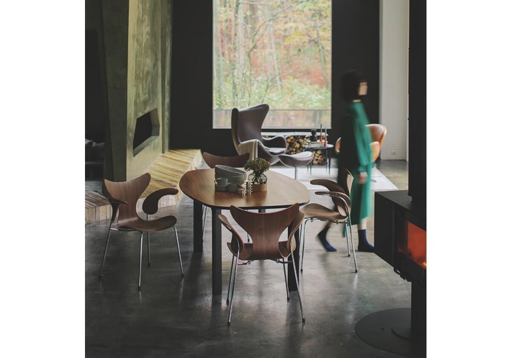 Lily von Arne Jacobsen für Fritz Hansen entworfen, ist ein Stuhl mit Armlehnen mit Rückenlehne und Sitz aus naturholzfarbenem Holzfurnier und verchromter Basis.