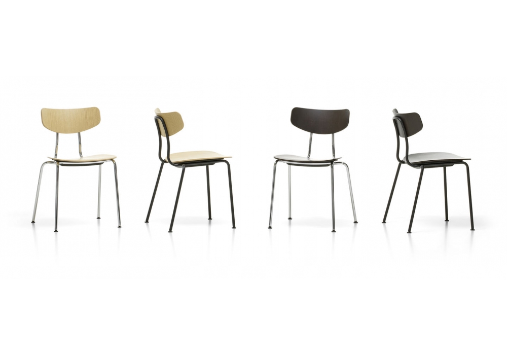 Moca von Jasper Morrison für Vitra entworfen, ist ein Stuhl mit Sitz und Rückenlehne aus eichenfurniertem Holz und Metall. Verfügbar in mehreren Ausführungen.