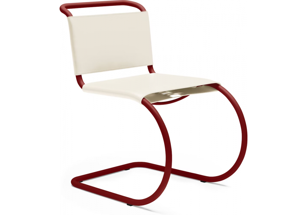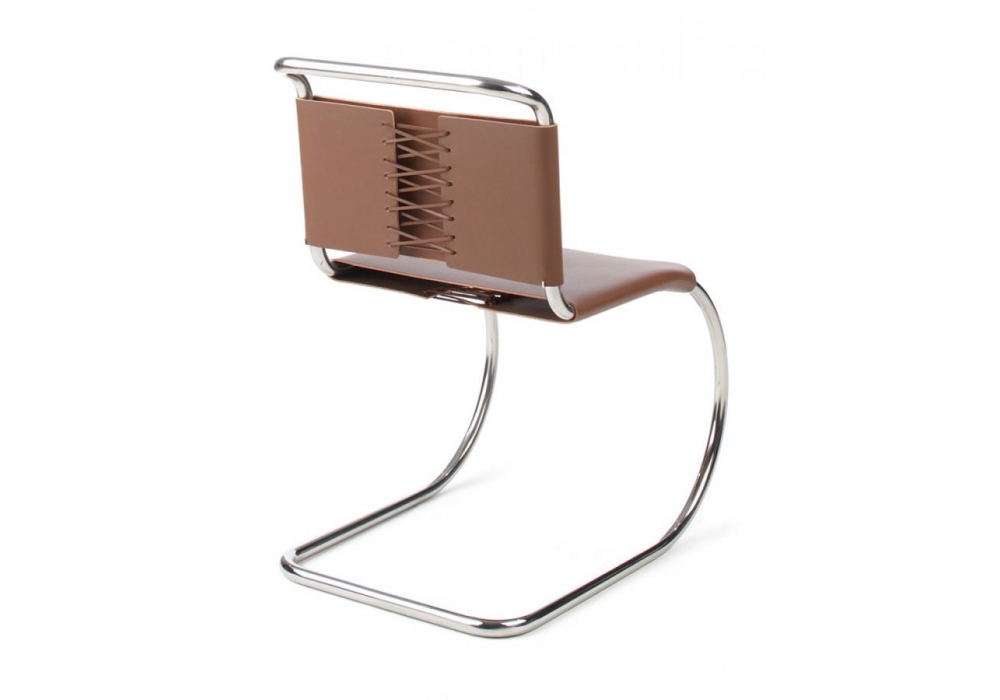 MR von Ludwig Mies van der Rohe für Knoll entworfen, ist ein Stuhl mit einer polierten verchromten Rohrstruktur oder mit ultramatter Epoxidfarbe. Polsterung mit Ledergurten mit Lederrückenschnüren.