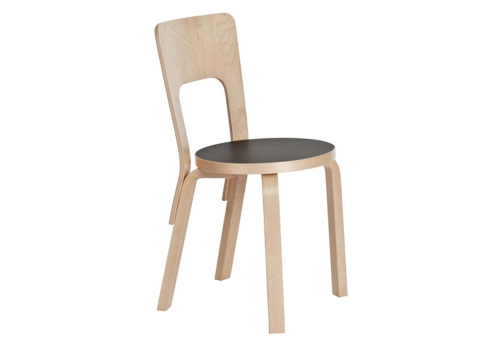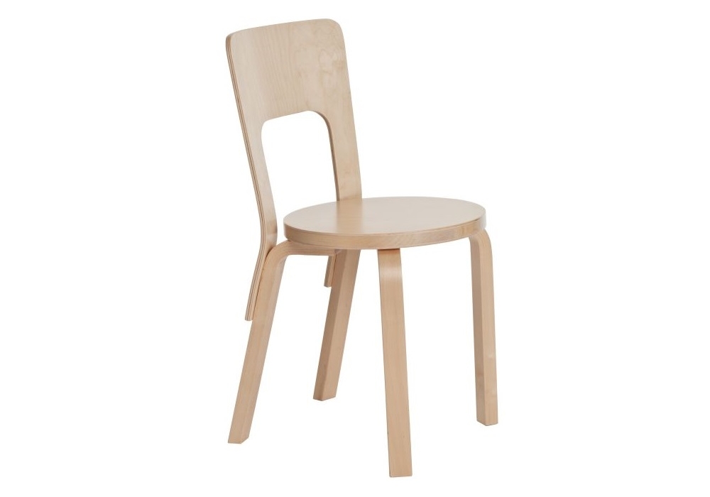 Chair 66 von Alvar Aalto für Artek entworfen, ist ein Stuhl aus Beinen, Sitzkantenband und Rückenlehne aus massiver Birke. Verfügbar in mehreren Ausführungen.
