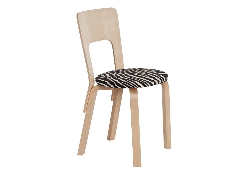 Stuhl 66 von Alvar Aalto für Artek entworfen, ist ein Stuhl mit Sitzpolsterung aus Stoff oder Leder. Beine und Rückenlehne lackiert. Verfügabr in mehreren Ausführungen.