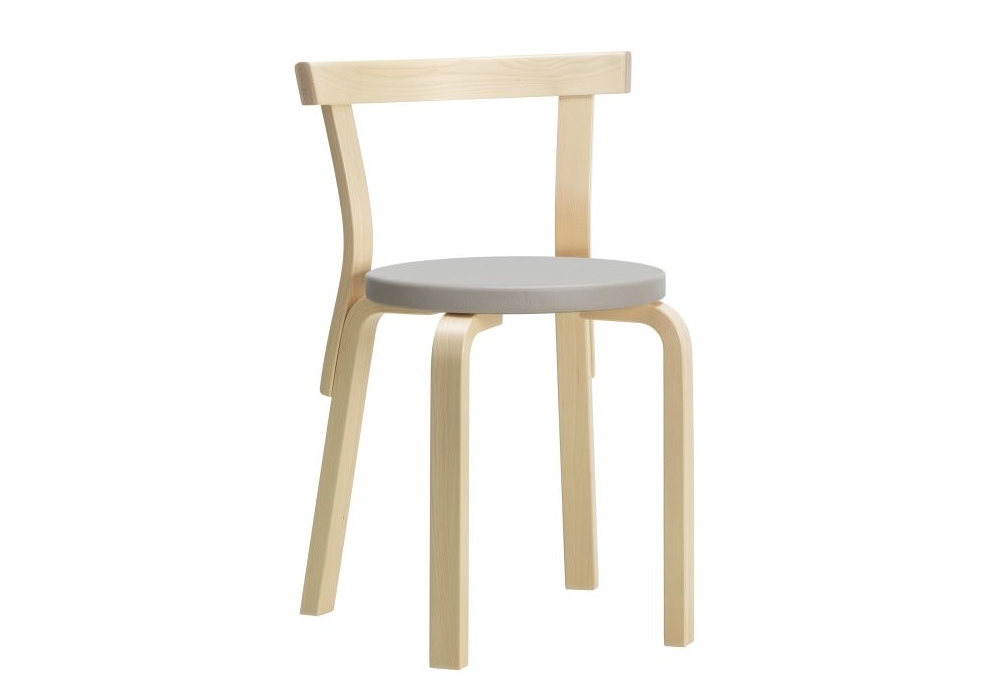 Stuhl 68 von Alvar Aalto für Artek entworfen, ist ein Stuhl mit Sitzpolsterung aus Stoff oder Leder. Beine und Rückenlehne lackiert. Verfügabr in mehreren Ausführungen.