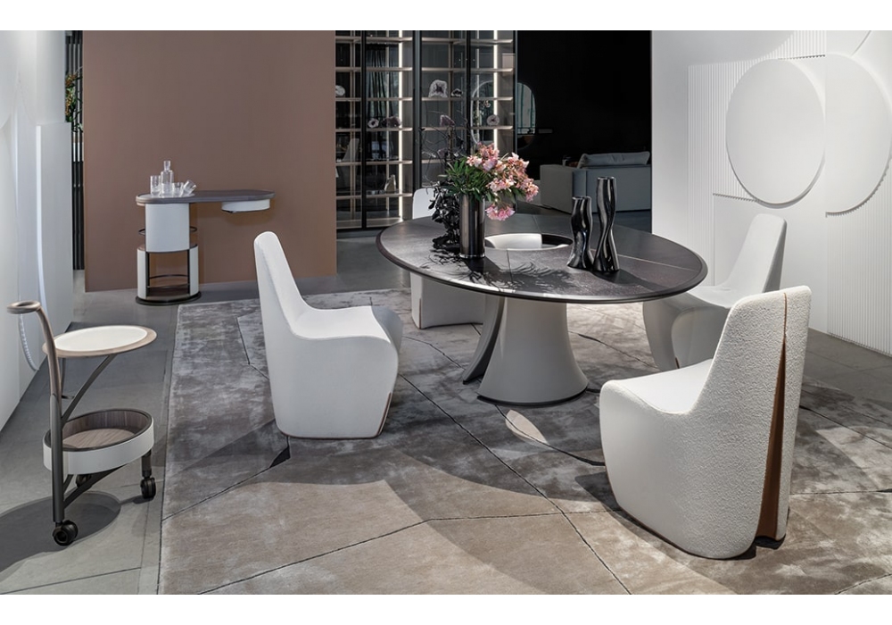 Tie von M2Atelier für Giorgetti entworfen, ist ein Stuhl mit Struktur aus Polimex (Polyester/Polyurethan-Verbundmaterial) und Polsterung aus Polyurethanschaum. Der abnehmbare Bezug aus Stoff oder Leder wird durch eine Keder und einen rückwärtigen Ledereinsatz bereichert. PVC-Füße. Ein Set Filzfüße wird mitgeliefert.