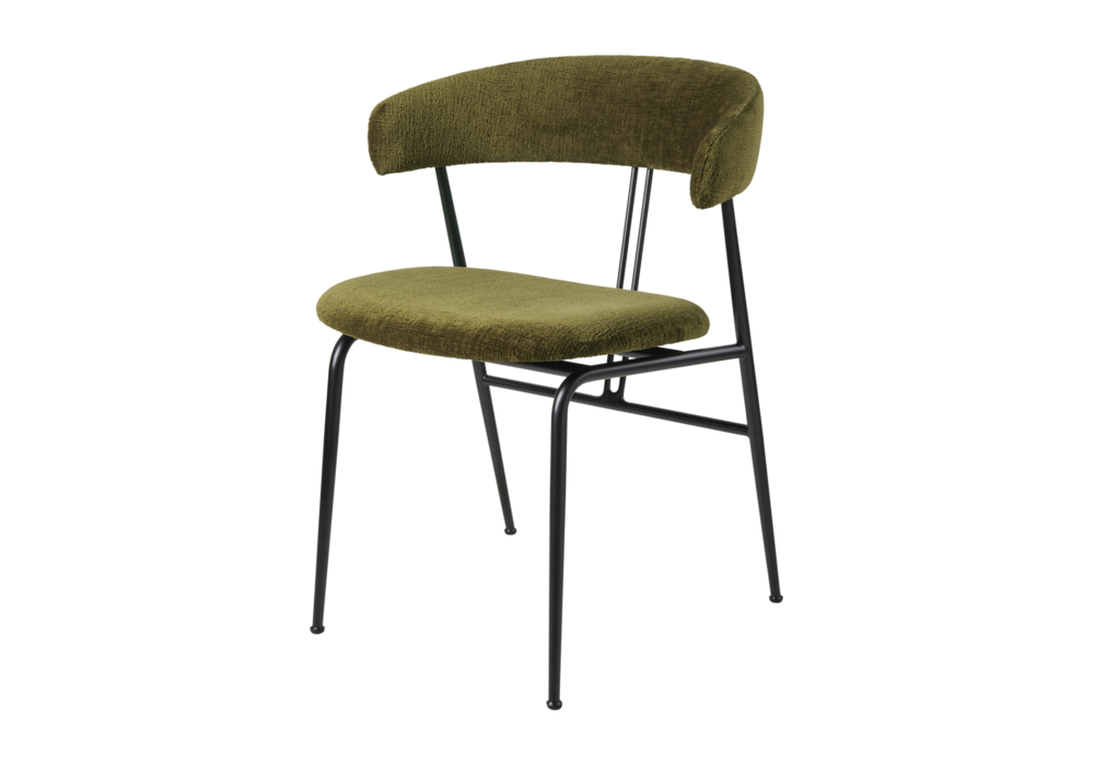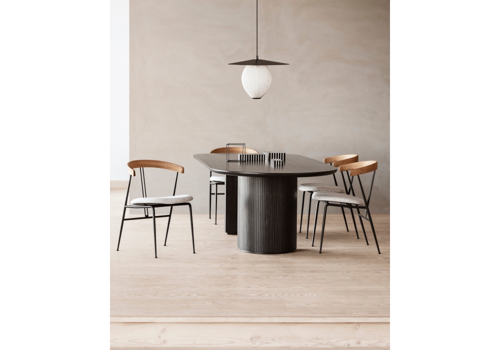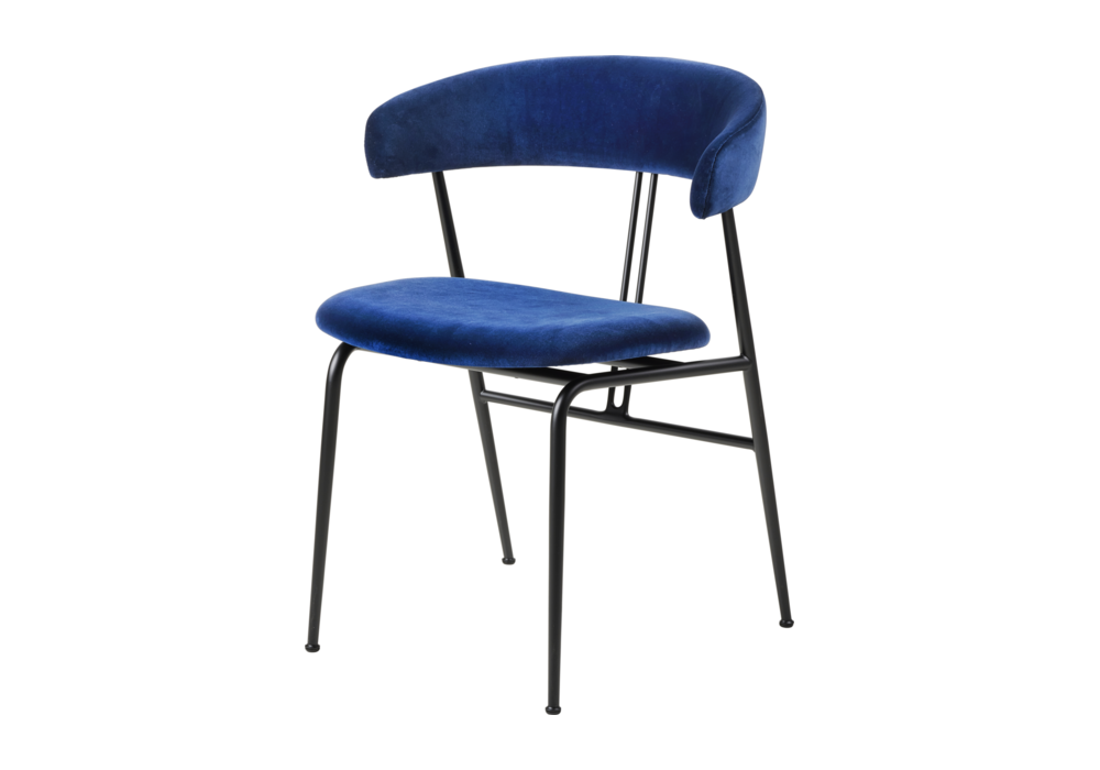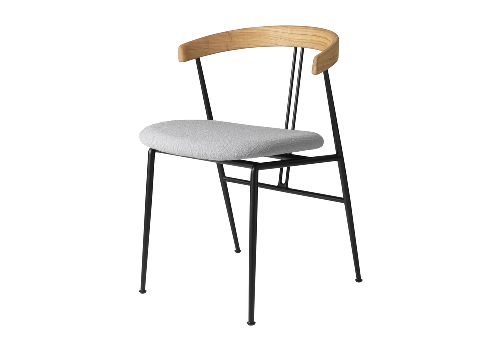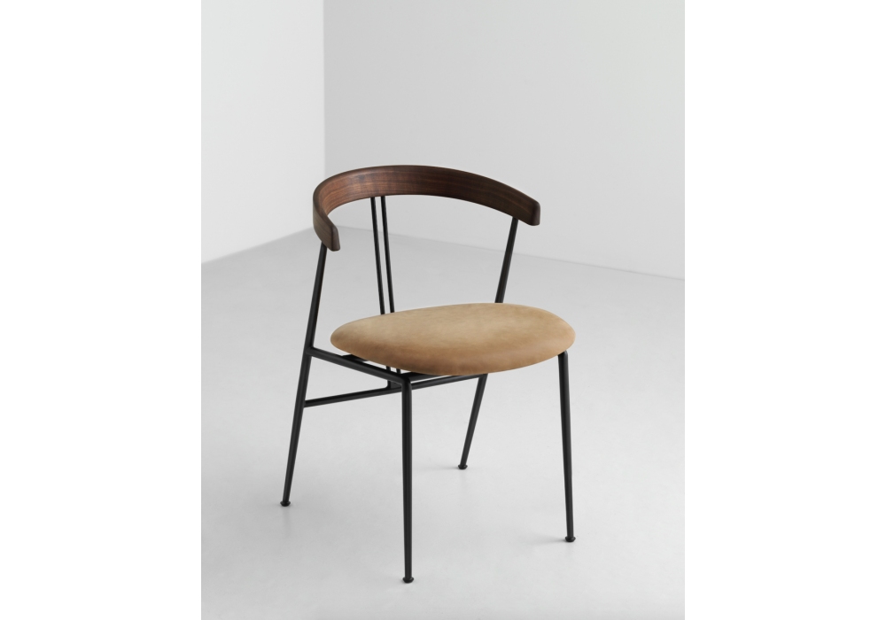 Violin von GamFratesi für Gubi entworfen, ist ein Stuhl bestehend aus Metallstruktur, Sitz mit Stoff- oder Lederbezug und Rückenlehne aus amerikanischem Nussbaum oder Eiche. Der Stuhl ist auch mit gepolsterter Rückenlehne erhältlich.
