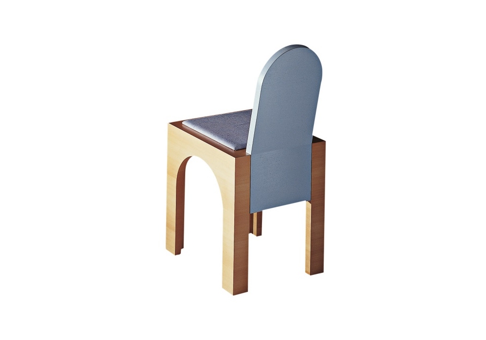 5020 Carabo von Ettore Sottsass für Zanotta Edizioni entworfen, ist ein Stuhl mit Sitz aus Sperrholz furniert in Hochglanz, Rückenlehne aus Sperrholz furniert in offenporig lackierter Esche in Lila, Rosa und Grün. Kissen mit Stoffbezug in den gleichen Farben.