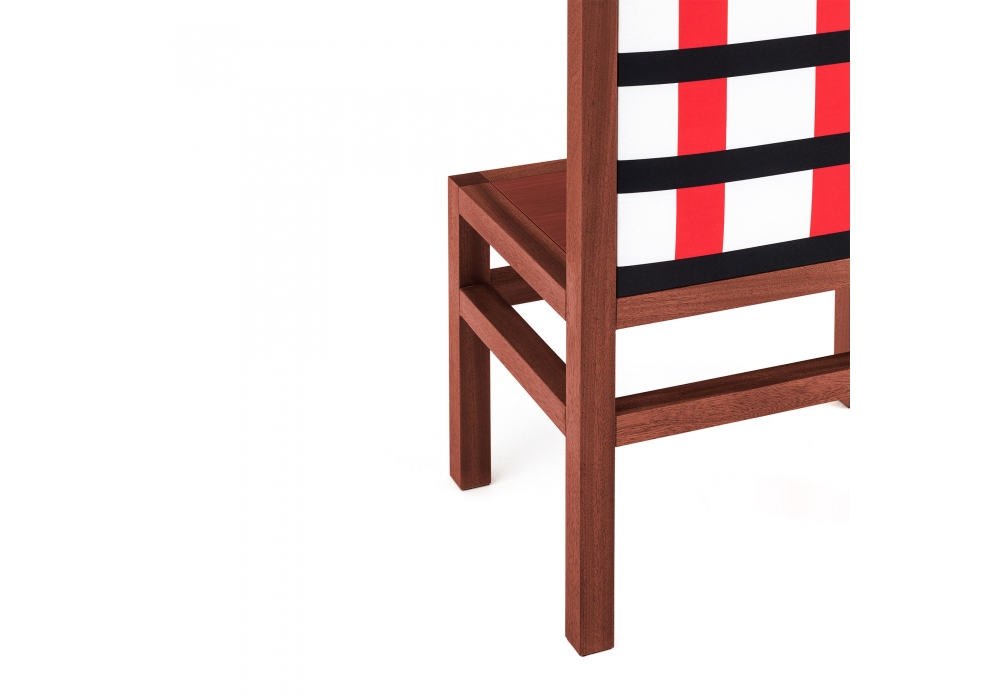 Marmo von Nathalie Du Pasquier für Memphis Milano entworfen, ist ein Stuhl aus Mahagoni, Sitz aus furniertem Holz, Rückenlehne aus bedrucktem Stoff.