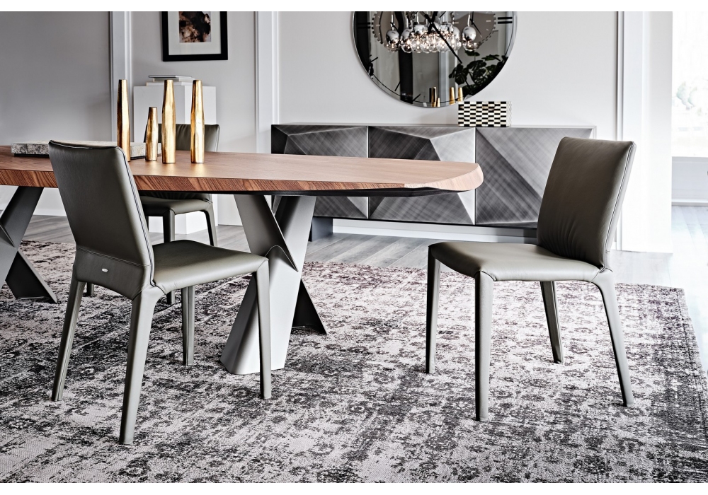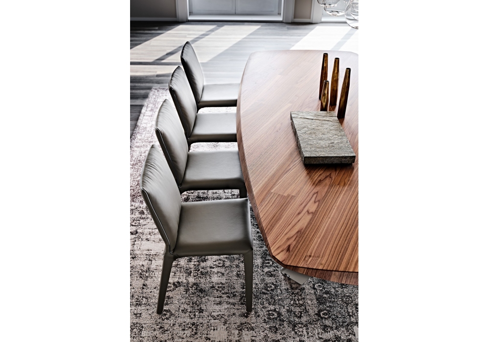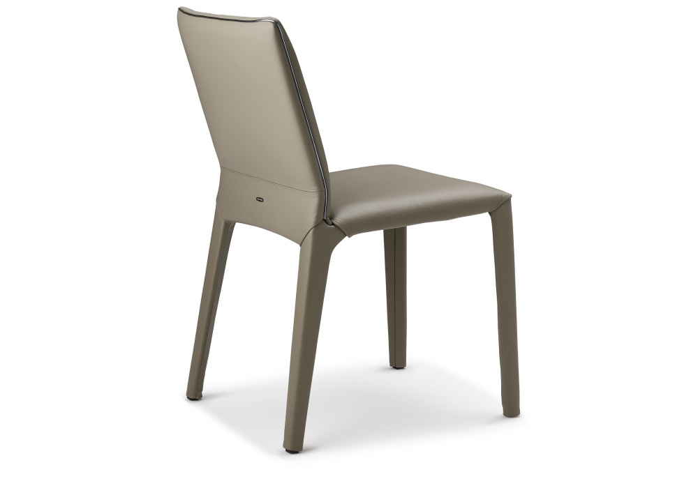 Penelope von Paolo Cattelan für Cattelan Italia entworfen, ist ein Stuhl ohne Armlehnen und Struktur aus Metall. Bezug aus Stoff, Kunstleder, synthetic nubuck, micro nubuck oder Softleder. Rückenlehnendekoration mit Rand in der Farbe Metallgrau.