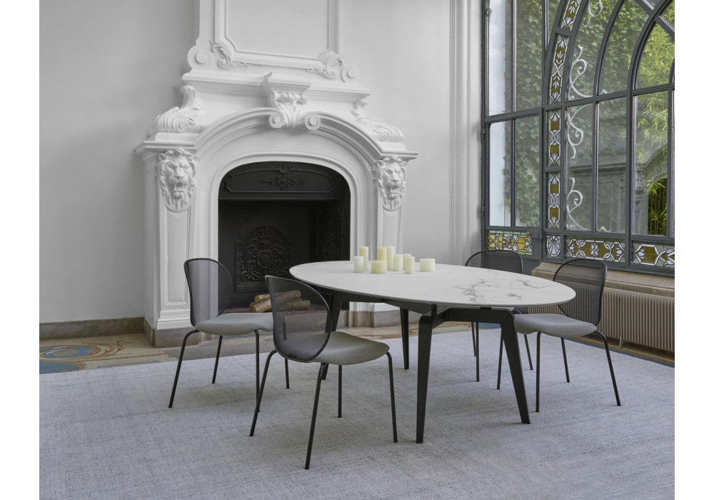Unbeaumatin von Quaglio Simonelli für Ligne Roset entworfen, ist ein Stuhl mit Gestell aus Stahlrohr mit schwarzer oder weißer Lackierung. Sitz gepolstert aus thermogeformtem ABS mit Schaumstoffummantelung. Bezug aus Stoff oder Leder.