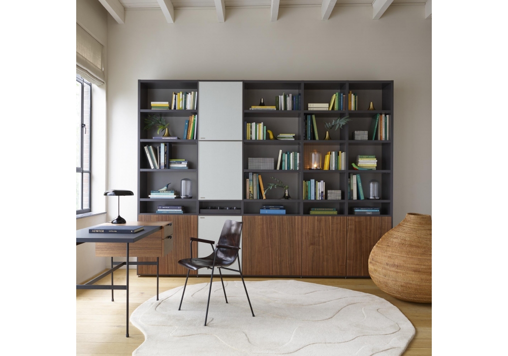 Cm 131 von Pierre Paulin für Ligne Roset entworfen, ist ein Stuhl mit ergonomischer Sitzschale aus dunkelbraun gebeizter Buche mit Hochglanz-Finish. Armlehnen aus massiver Buche, passend zur Schale gebeizt. Untergestell aus schwarz lackiertem Rundstahl mit Schutzkappen an den Beinen.