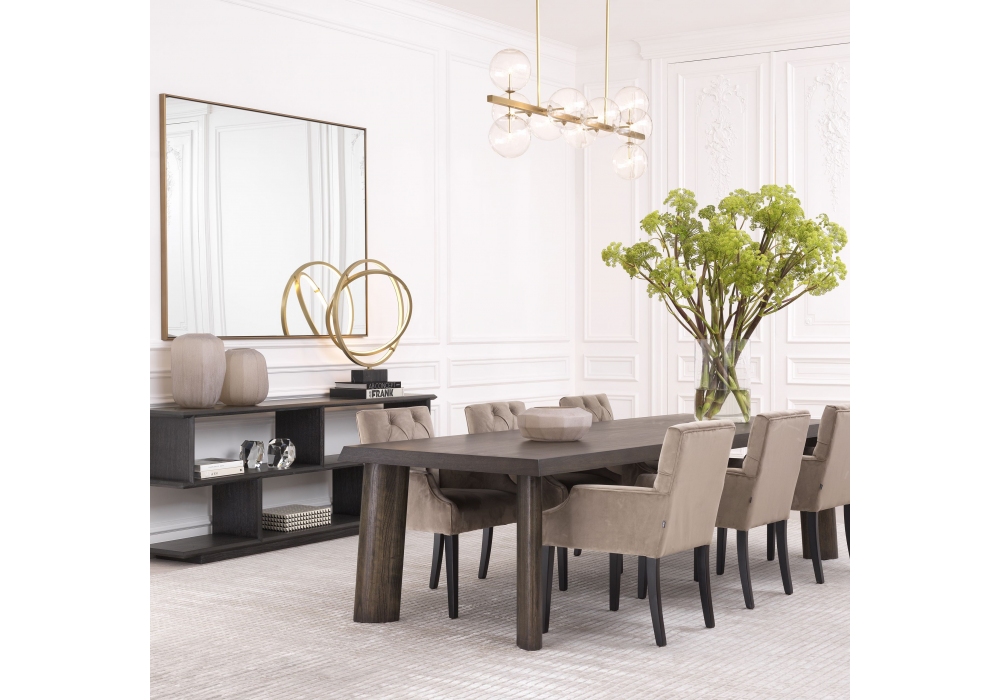 Atena von Eichholtz entworfen, ist ein samtbezogener Stuhl mit schwarzen Beinen. Es ist mit oder ohne Armlehnen erhältlich.