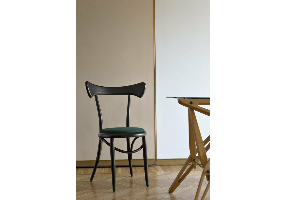 Café von Nigel Coates für Gebrüder Thonet Vienna entworfen, ist ein Stuhl aus gebeiztem oder lackiertem Buchenholz, gepolsterter Sitz mit Polsterung verfügbar in verschiedenen Ausführungen.