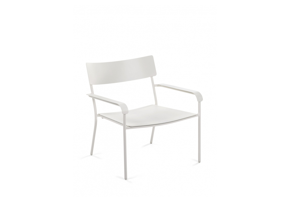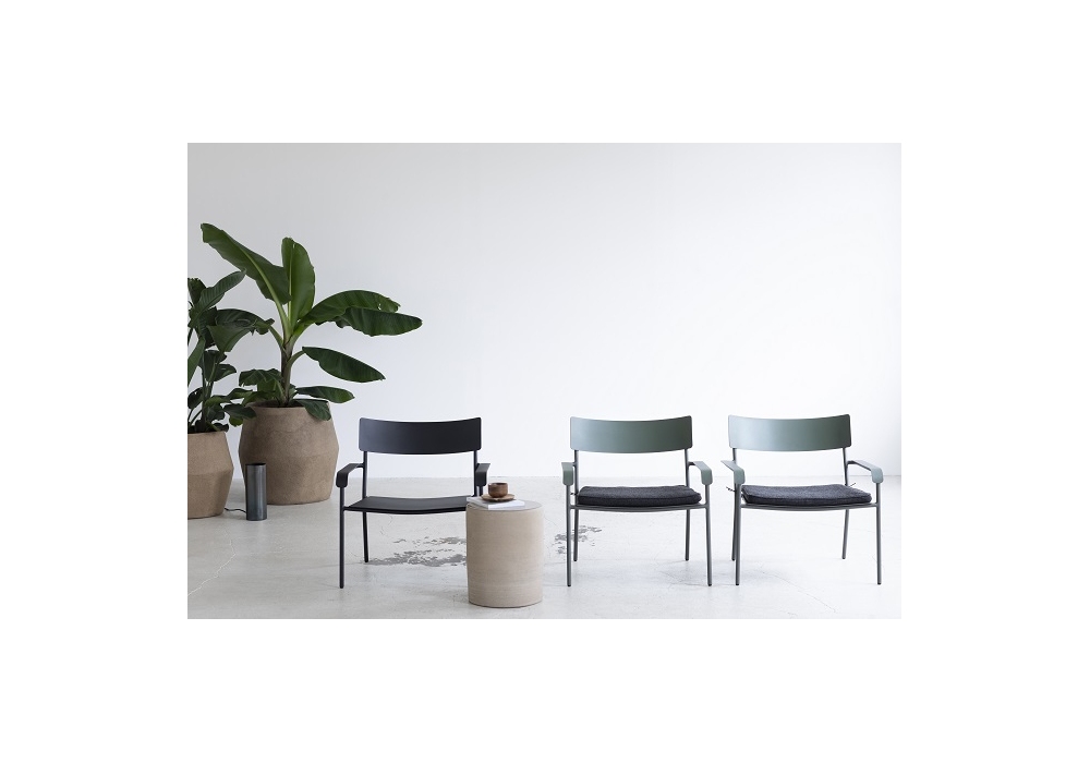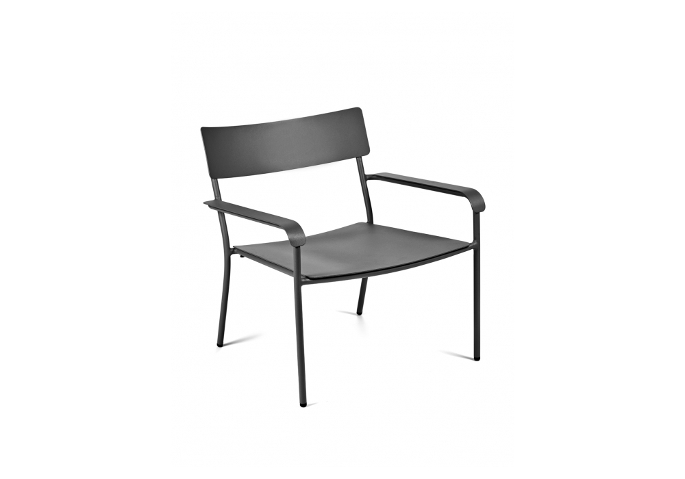 August von Vincent Van Duysen für Serax entworfen, ist ein niedriger Stuhl mit Armlehnen, innen konzipiert aus pulverbeschichtetem Aluminium in drei verschiedenen Ausführungen; schwarz, eukalyptusgrün oder sand. Rückenlehne und Sitzfläche sind etwas breiter als ein klassischer Sitz, um optimalen Komfort zu gewährleisten und können sowohl als Indoor- als auch als Outdoor-Stuhl verwendet werden.