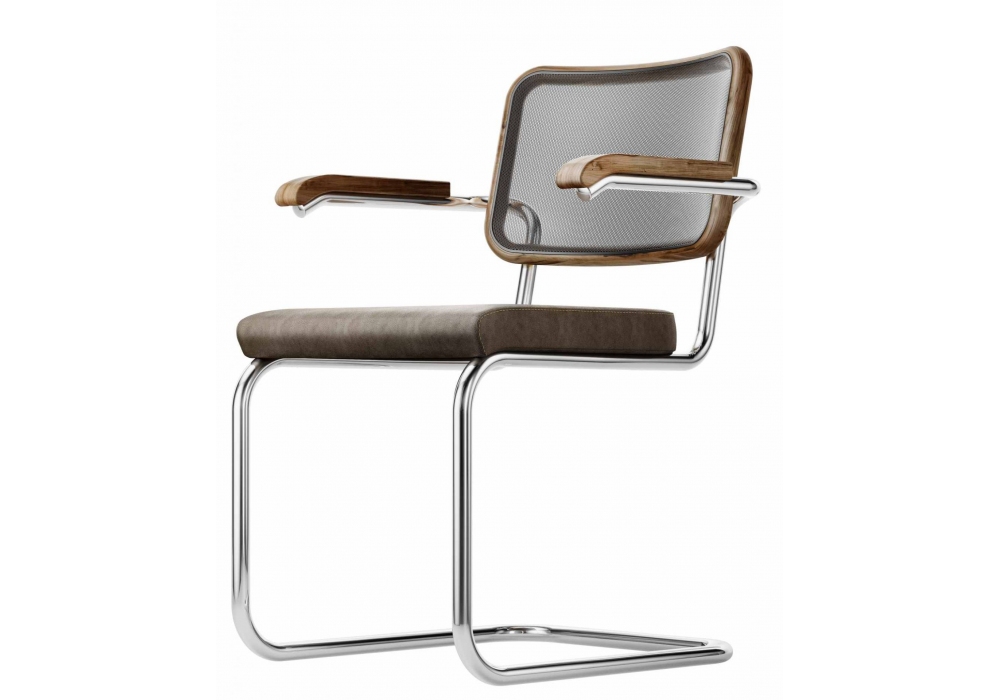 S 64 SPVN von Marcel Breuer, Künstlerisches Copyright Mart Stam für Thonet entworfen, ist ein Stuhl auf Kufen mit verchromtem Stahlrohrrahmen. Gepolsterter Sitz mit Stoff-, Leder- oder Sattellederbezug. Rücken aus Mesh-Gewebe. Armlehne in gebeizter Buche, Eiche oder Nussbaum in verschiedenen Ausführungen erhältlich. Auch der Kordelzug und die Nähte sind in verschiedenen Ausführungen erhältlich.