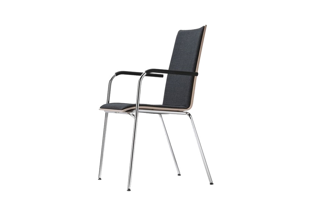 S 164 P / PF von Delphin Design für Thonet entworfen, ist ein stapelbarer Stuhl mit Gestell aus verchromtem Stahlrohr und Kunststofffüßen. Sitz und Rückenlehne aus Buchensperrholz, in verschiedenen Ausführungen, mit Stoff-, Leder- oder Lederbezug bezogen. Der Stuhl ist auch mit oder ohne Armlehne erhältlich.