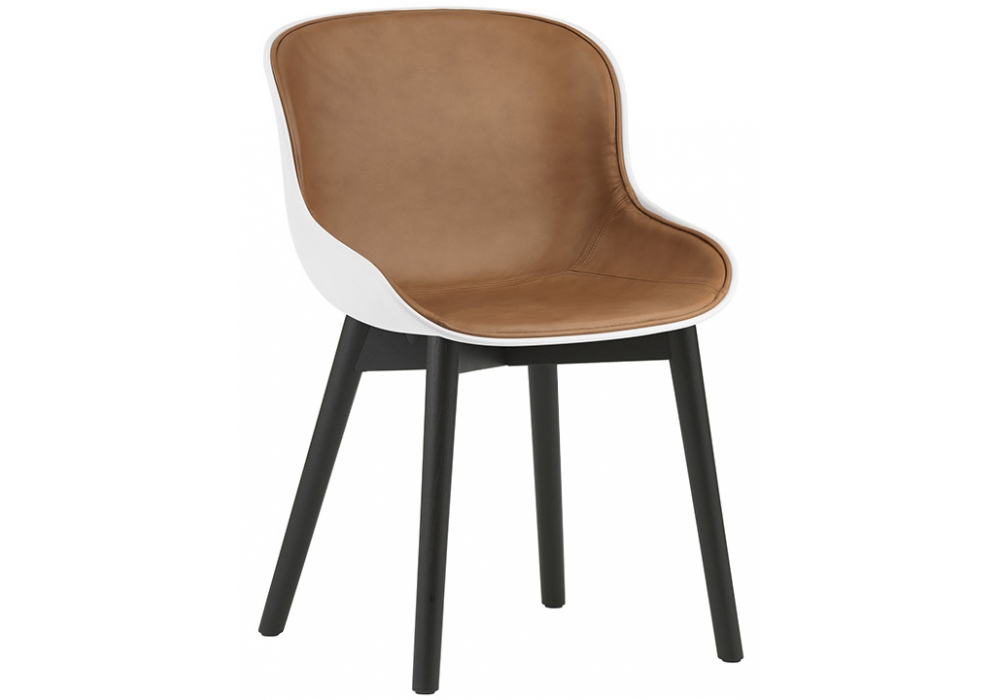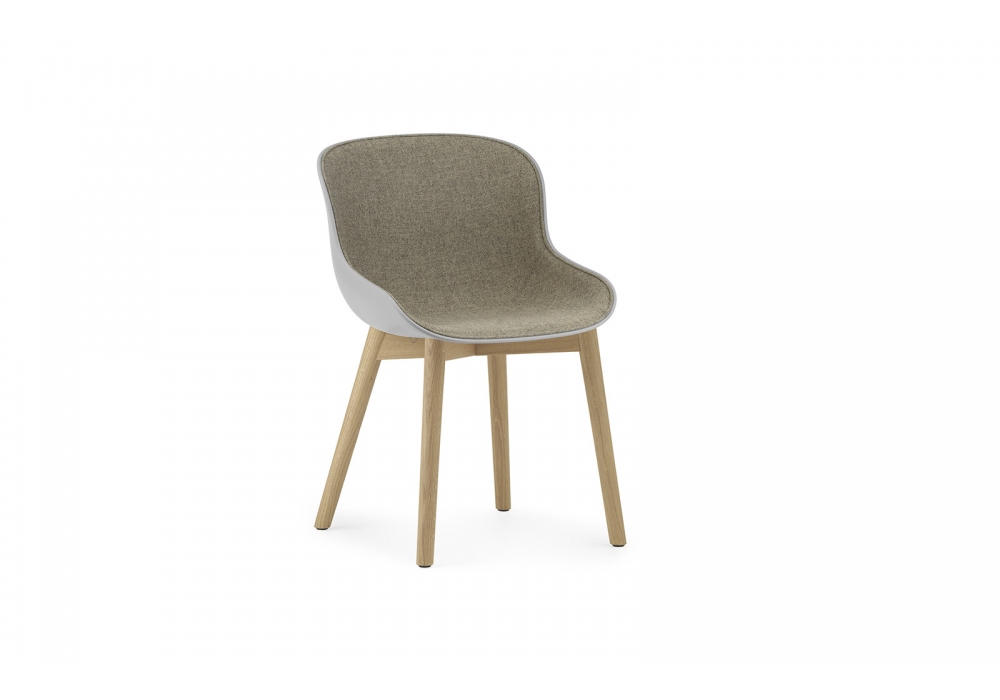 Hyg, entworfen von Simon Legald für Normann Copenhagen, ist ein Stuhl mit Sitzschale aus Polypropylen, die mit Leder oder Stoff in verschiedenen Ausführungen bezogen ist. Die tragende Struktur ist aus Eiche in den Farben Natur oder Schwarz.