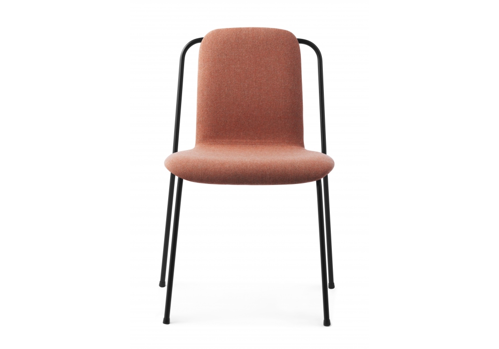 Studio, entworfen von Nicholai Wiig Hansen für Normann Copenhagen, ist ein Stuhl mit Holzschale, die vollständig mit Leder oder Stoff in verschiedenen Ausführungen bezogen ist. Die tragende Struktur besteht aus pulverlackiertem Stahlrohr in einer einzigen schwarzen Farbe.
