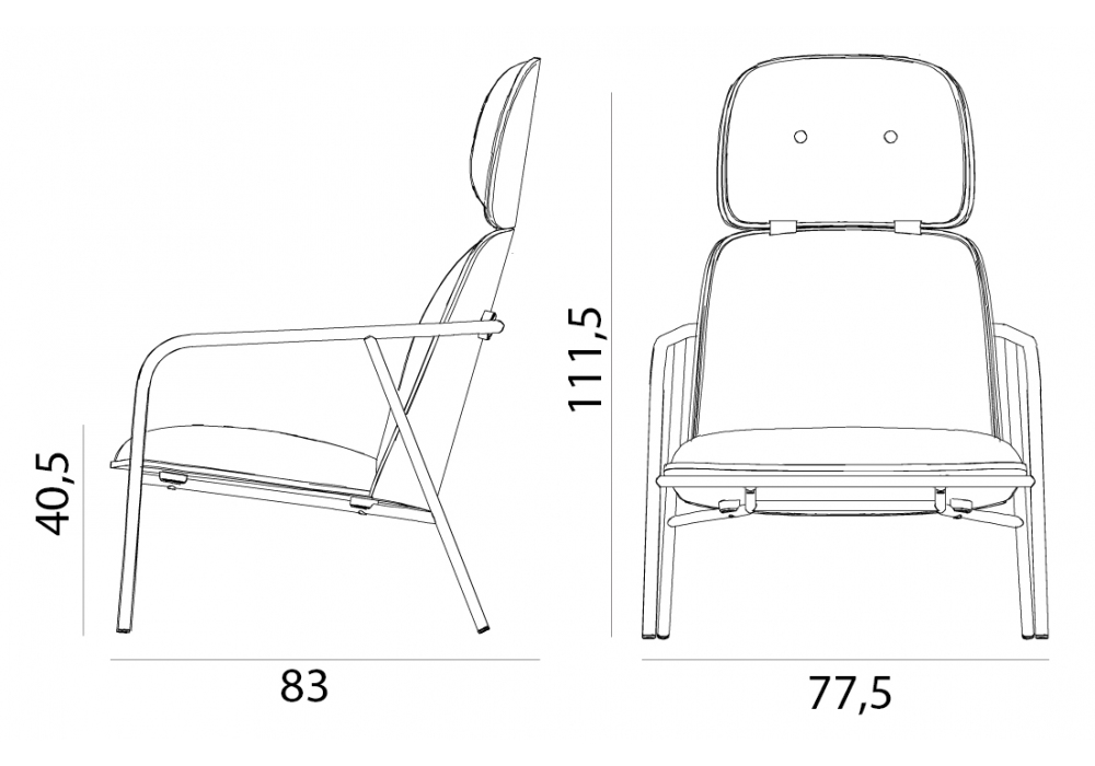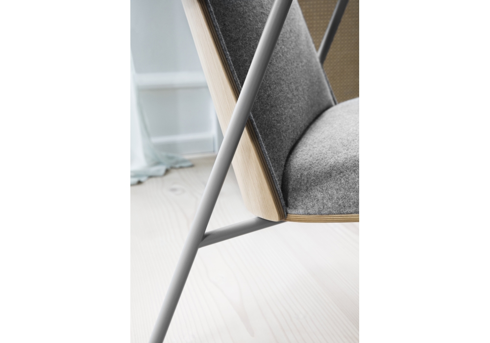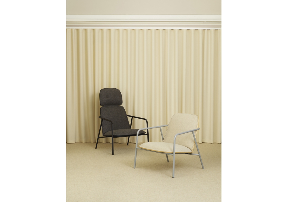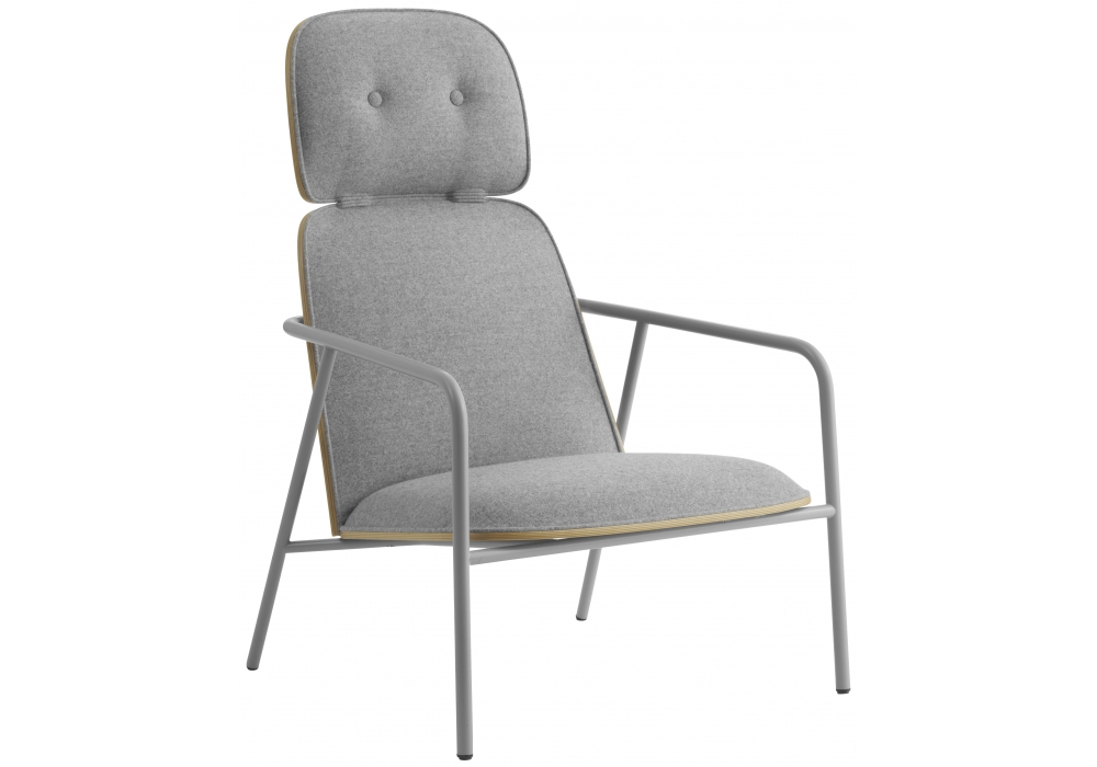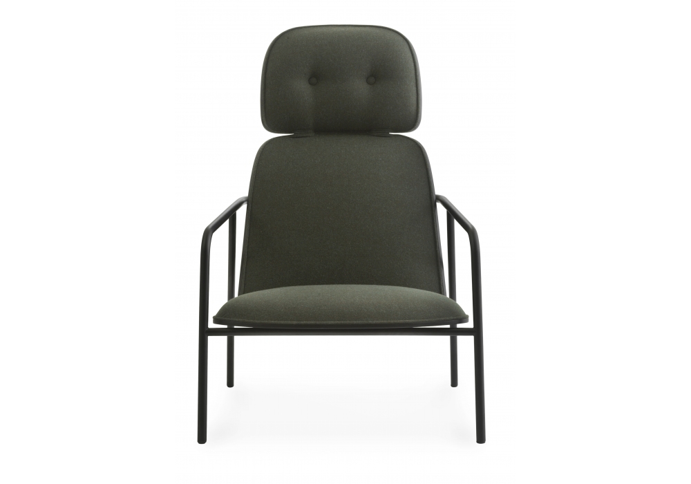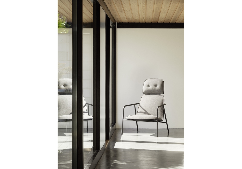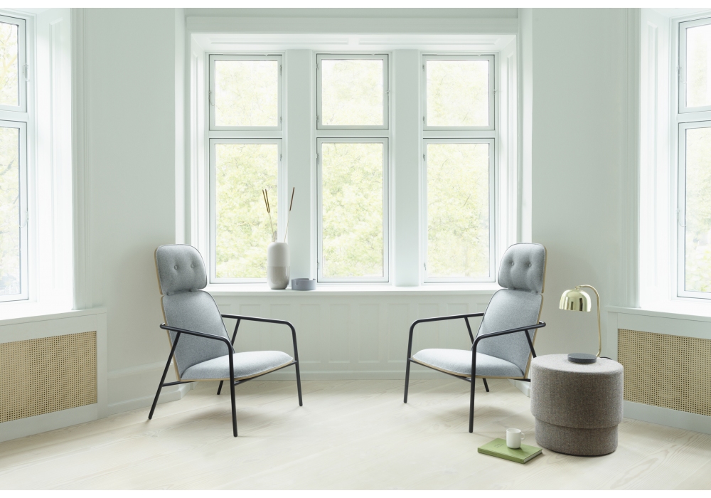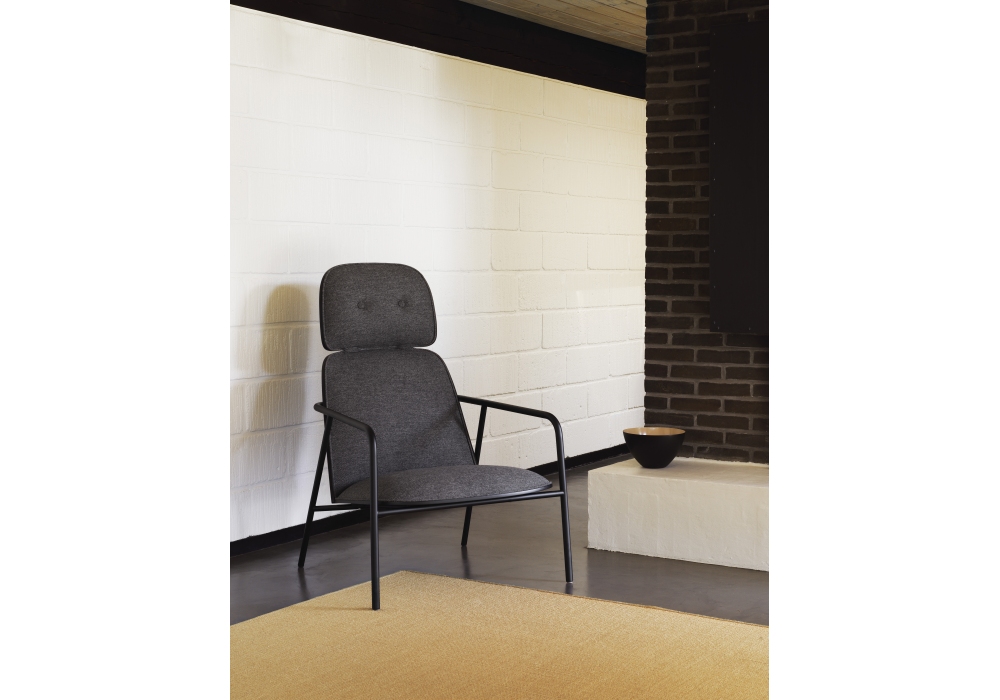 Pad, entworfen von Simon Legald für Normann Copenhagen, ist ein Sitz mit röhrenförmiger Struktur aus schwarz oder grau pulverbeschichtetem Stahl. Sitz, Rücken und Kopfteil sind aus Holz, in Schwarz oder Naturholzausführung, gepolstert mit PU-Schaum, bezogen mit Stoff oder Leder in verschiedenen Farben.