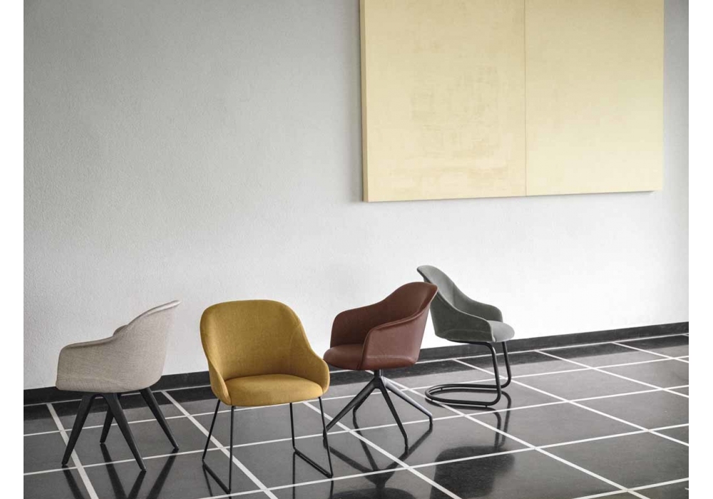 Lyz SLI von Mario Ferrarini für Potocco entworfen, ist ein Stuhl mit Kufengestell aus Metall in geprägtem Anthrazit oder geprägtem Schwarz. Sitz und Rückenlehne sind mit feuerfestem Polyurethanschaum gepolstert und mit verschiedenen Stoffen, Leder oder Kunstleder bezogen.