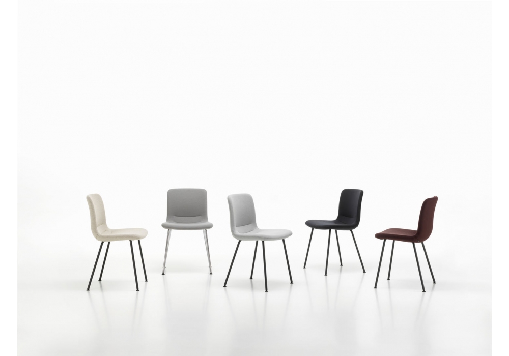 HAL Soft Tube von Jasper Morrison für Vitra entworfen, ist ein Stuhl mit Schale aus glasfaserverstärktem Polyamid, Polsterung aus Polyurethanschaum und Stoffbezug. Vierfußgestell aus Stahlrohr, verchromt oder lackiert.