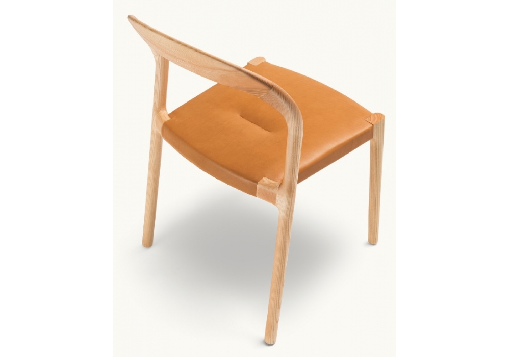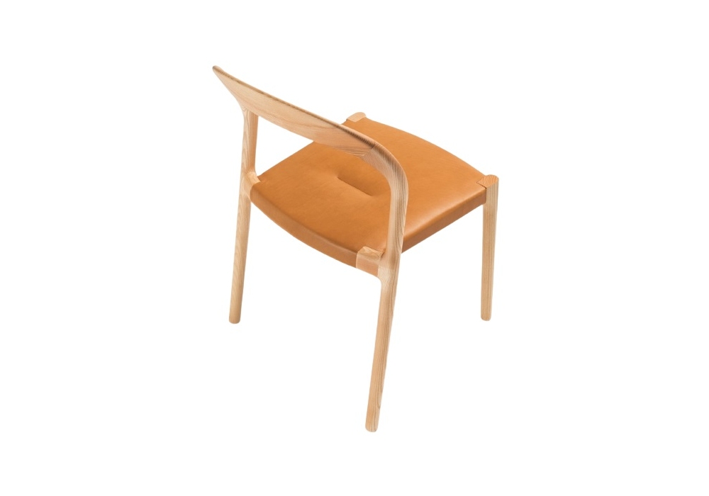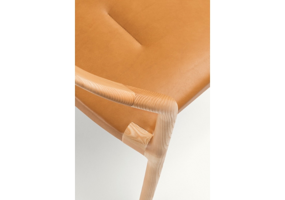 Ticino von Shibuleru für Living Divani entworfen, ist ein Stuhl aus Eschenholz massiv, mit Eckverstärkungen aus Blech Stahl, verfügbar in den Farben Natur und Anthrazit, mit gepolstertem Sitz aus Stoff oder Leder.