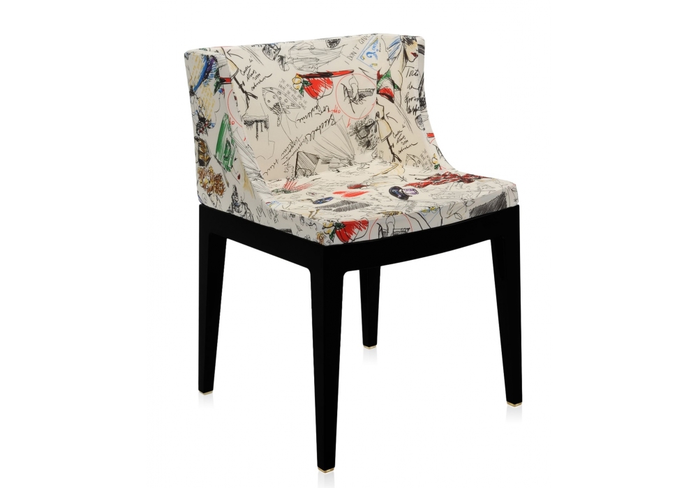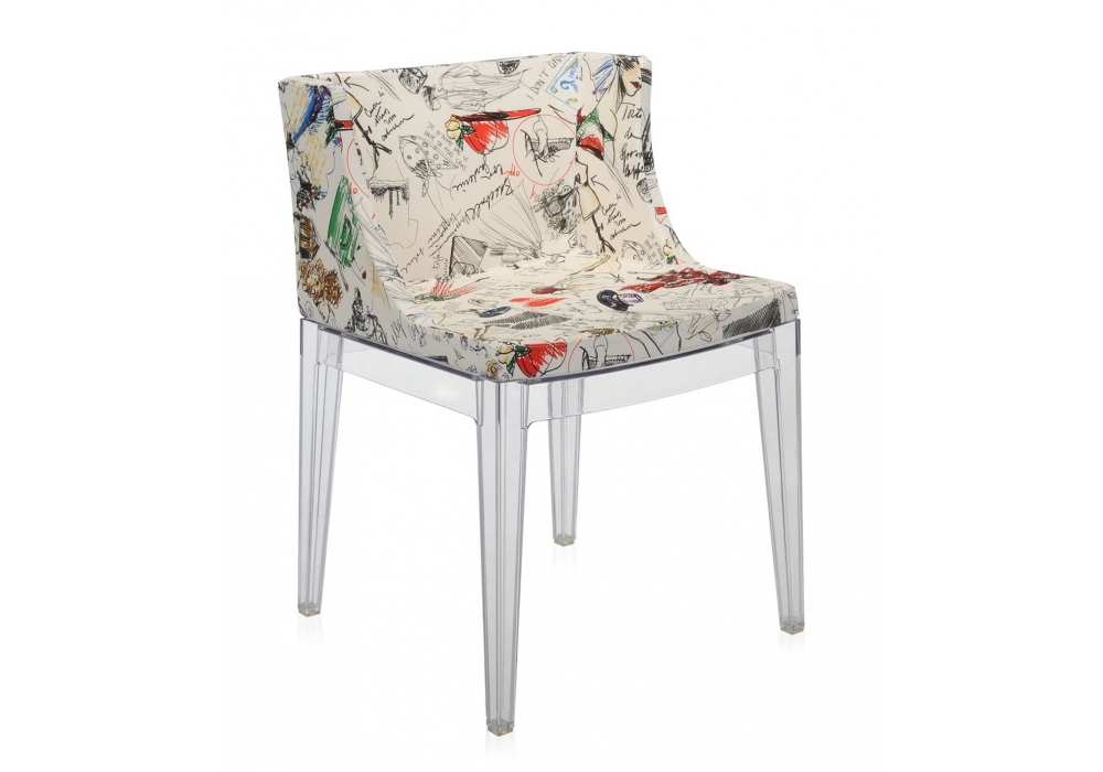 Mademoiselle "à la mode" Moschino von Philippe Starck für Kartell entworfen, ist ein Stuhl mit Struktur aus transparentem oder schwarzem durchgefärbtem Polycarbonat und Sitz aus Polyurethan, bezogen mit Moschino-Stoff.